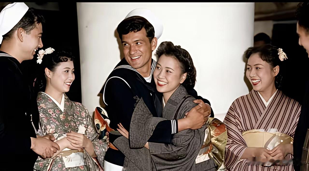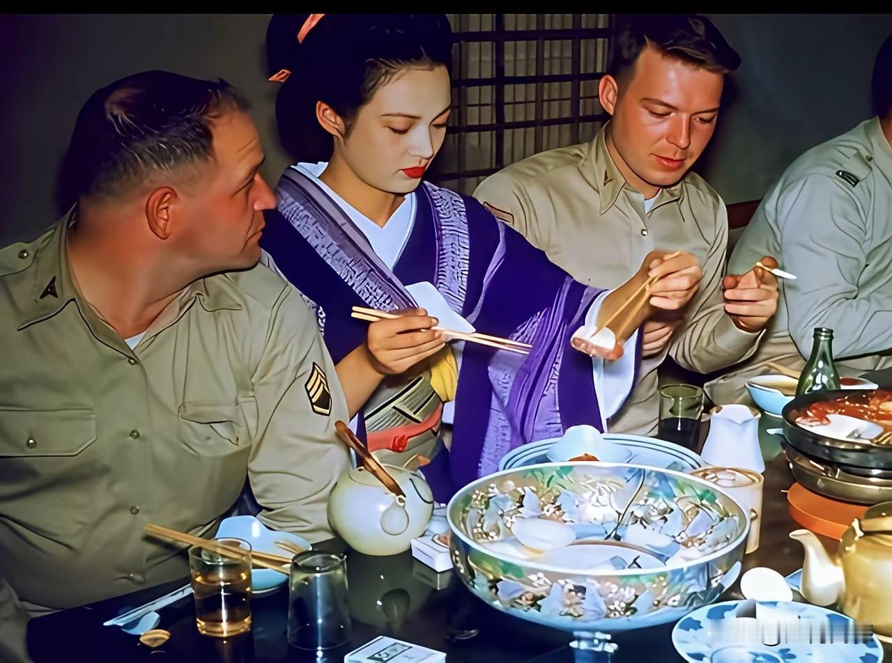 日本女子所穿的衣服,面料应该是丝绸的,看起来特别的华丽,非常的漂亮,当年她们的这身穿着打扮,以及她们独特的气质,对这些美国大兵来说,是非常新奇的,也是非常有吸引力的,有这些女子陪着吃吃喝喝,他们也是乐不思蜀,非常的快乐!
