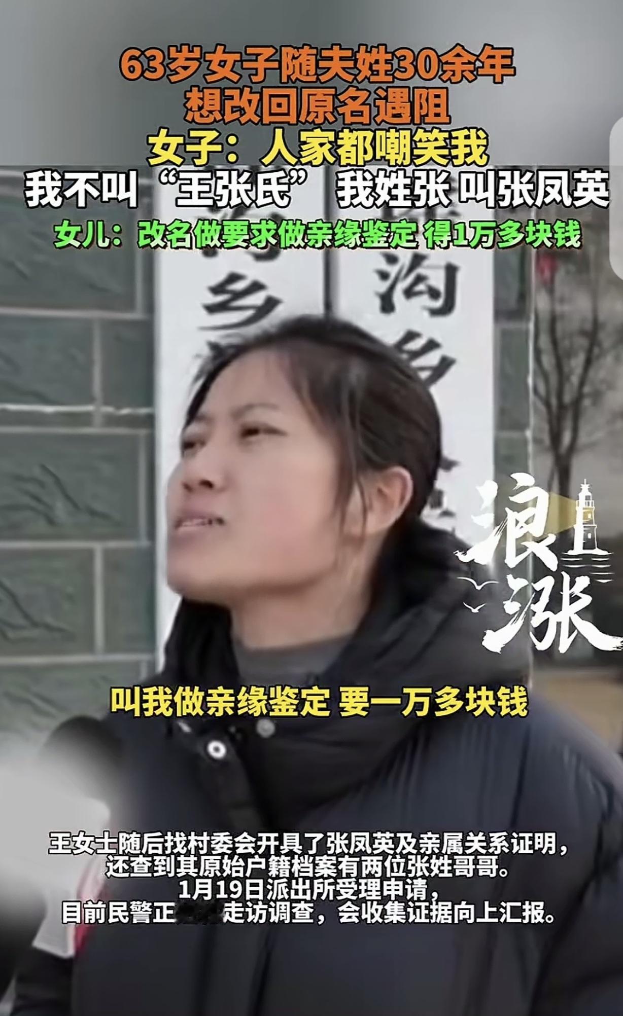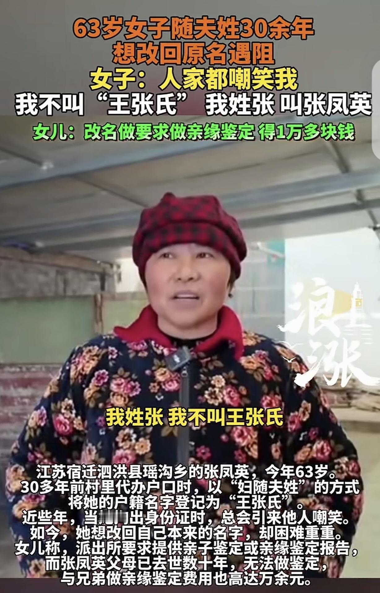 江苏宿迁,一63岁女子,30年前村里带办户口时,说“妇随夫人姓”,把她的名字登记成“王张氏”,每次她拿出身份证,都会招来嘲笑,女子一气之下,决定改回自己名字,不料却被要求提供亲子鉴定或亲缘鉴定,父母都去世几十年了,咋做鉴定?女子被告知,可以和她兄弟做鉴定,当女子得知鉴定费得10000多元时,她傻眼了:想做回自己,咋就那么难! 63岁的张凤英,做梦都想把自己名字从“王张氏”改回“张凤英”,可谈何容易? 原来,30年前,已经嫁作人妇的张凤英,村里带办户口,说女人嫁夫随夫,挞丈夫姓王,,她就得叫张王氏。 这都什么年代了,又不是旧社 会,谁还这么叫呀?可张凤英没注意,没有反驳,她的名字就从张凤英,变成了王张氏。 可出乎张凤英意料的是,没想到这件事给她惹来那么多麻烦,她觉得无所谓,但每次用到身份证时,她拿出来,就会被人嘲笑。 张凤英这才意识到,名字不仅是她的符号,也是她的尊严,这么多年,她无时无刻不想把名字改过来,找回自尊。 女儿王女士支持母亲这么做,她认为母亲不是父亲的附属品,嫁人随夫姓,这是男尊女卑,思想落伍,新时代女性,人格独立,不是任何人的私有物品。 可万万没想到,张凤英提出改名申请,被告知她要提供亲子鉴定或者亲缘鉴定,证明自己姓张才行,否则改不回去。 张凤英傻眼了,父母去世几十年了,她跟谁做鉴定去?这不刁难人吗? 张凤英又被告知,这个不难,她可以跟兄弟做鉴定,但她一打听,鉴定费高达10000多,她没这笔钱,有也不舍得花呀。 这怎么办呢?张凤英就想在不花钱的情况下,把名字改回去,她觉得这是自己的正当权益,凭啥不行? 最终女儿王女士,找村委开了一张张凤英和亲属的关系证明提交了上去,等待审核。 1月19日,这个申请被受理,警方表示会走访调查,然后向上级汇报。 有人说,我奶奶姥姥都去世了,她们若是活着,有一百零几岁了。她们都有自己的名字。从来没这样的。当地大队登记姓名时,就没把她们当一个独立的人。都解放多少年了。居然不给老太太自己的名字。 63岁的人把自己的姓搞掉了?不可思议!刚解放的时候,上面就提出让那些已婚女人自愿把自己的姓氏改回原性,这个女人怎么会把自己的姓搞掉呢?不合常理。 古代都是这么叫的,只不过给女性争取了权利以后这种叫法少了,但是如今漂亮国好多还是以夫之姓冠妻之名,比如劳拉布什,希拉里克林顿,还有日本的安倍晋三的遗孀安倍昭惠。 依据《姓名登记条例(初稿)》第18条,公民有正当理由可以申请变更姓名,包括姓名违背公序良俗、与他人重复等。 当地要求当事人提供亲子鉴定才准予更名,属于对更名条件的不当扩张。 村委出具的亲属关系证明结合警方走访调查,足以佐证当事人原名,无需额外支付高额鉴定费,这一要求违背便民原则,侵害了当事人的姓名权。 这件事看着就让人窝火,好好一个大活人,想改回自己本名咋就这么难? 几十年前登记户口时被强行冠上夫姓,搁到现在早就不合时宜了。 都2026年了,还拿旧社会“嫁夫随姓”那一套来套人,本身就离谱。名字是一个人最基本的身份符号,关乎的是人格尊严,不是谁的附属品。 要求做亲子鉴定更是不近人情。老人父母都去世几十年了,让她去哪儿找血缘亲属做鉴定?张口就是一万多的鉴定费,普通老百姓哪里舍得花这个冤枉钱?难道没钱就不配做回自己了?这明显是在设置不合理的门槛。 其实证明一个人叫啥、姓啥,根本没必要搞这么复杂。村委开个证明,街坊邻居、亲戚朋友做个证,再加上警方走访调查,这些证据难道还不够吗?非要让老人花钱做鉴定,本质上就是教条主义,没真正站在普通人的角度解决问题。 好在最后受理了申请,还表示会走访调查。 咱们一直在说尊重人权、保障权益,姓名权就是最基础的一项。别让那些僵化的流程折腾人。尤其是对这些辛苦了一辈子的老人,多些体谅,少些刁难,才是真正的文明进步。 对此,你怎么看? 关注@运良说法