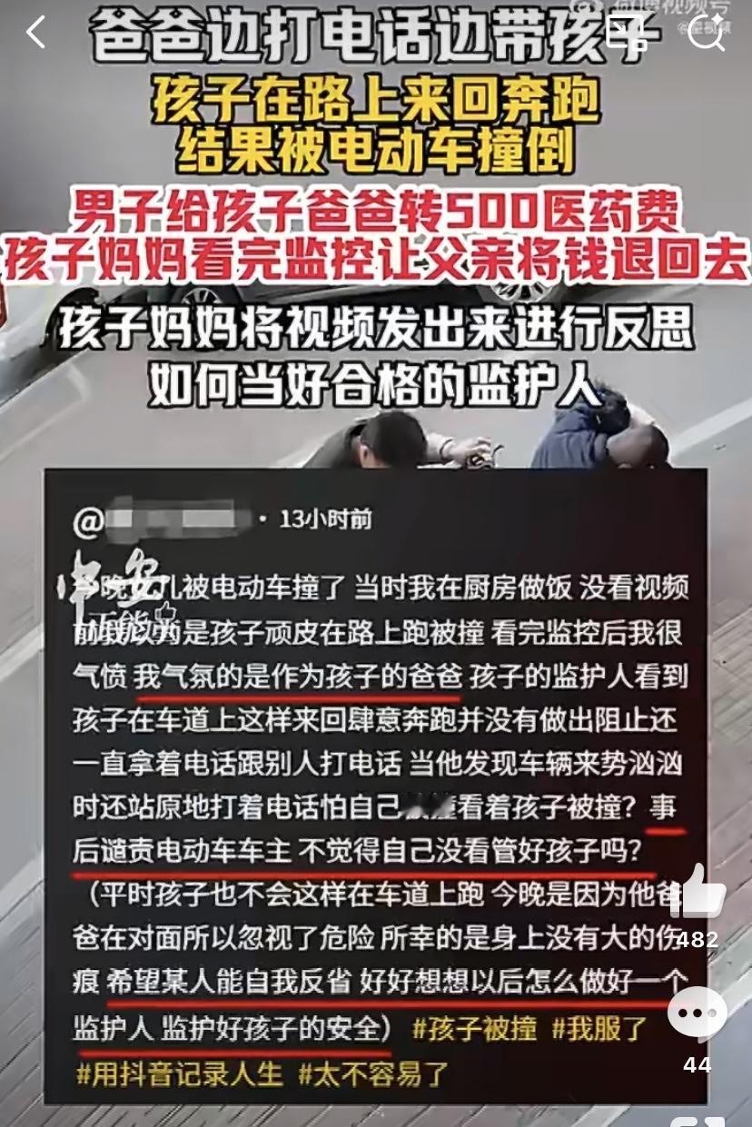 最近刷到广东这位妈妈的视频,真的越看越让人打心底佩服。监控里拍得明明白白,孩子爸爸一边打电话一边带着娃,两个小朋友在路边人行道上来回跑着打闹,没一会儿女儿就被一辆路过的电动车撞倒了。孩子爸爸当时就急了,冲着骑电动车的男子嚷嚷“那么快干嘛”,对方也挺有担当,当场就转了50块医药费。结果孩子妈妈看完监控,二话不说就让爸爸把钱退了回去,还说“大家赚钱都不容易,主要是我们没看好孩子”,之后又把视频发出来反思,琢磨着怎么才能当好合格的监护人。 说实话,看完这事儿我真的被这位妈妈圈粉了。现在好多人遇到这种事,第一反应就是找别人的错处,不管三七二十一先把责任推出去,恨不得能多要些赔偿才甘心。可这位妈妈不一样,她没有盲目护短,而是对着监控冷静复盘,清清楚楚知道是自己家大人监护不到位——孩子爸爸打电话分心,没把乱跑的孩子看住,才导致了意外。这种明事理、有担当的态度,真的太难得了。而且她还主动退回这50块医药费,那句“大家赚钱都不容易”,既体谅了对方的难处,也守住了自己的底线,难怪网友都在夸她格局大、三观正。 其实这事儿也给所有家长敲了个响警钟,带孩子出门真的半点都不能分心。现在好多家长带娃的时候,要么刷手机要么接电话,总觉得孩子在身边跑一跑没事,可孩子年纪小,对危险没什么概念,尤其是在路边这种地方,车来车往的,稍微不注意就可能出意外。法律早就明确说了,父母对未成年人有监护职责,保障孩子的安全是最基本的要求,可现实中,很多意外就是因为家长一时分心造成的。就像之前有个爸爸开车时给孩子演示玩具,结果车子失控掉进水沟,还有的家长低头看手机的功夫,孩子就横穿马路被撞,这些教训都太深刻了。 这位妈妈最难得的地方,还在于她没有回避问题,而是主动把视频发出来反思。带娃哪有不犯错的?但关键是犯错之后能不能正视问题。她不仅自己反思监护不到位的问题,还提醒其他家长要当好监护人,这种分享和警醒,比任何说教都管用。现在好多家长遇到事情要么藏着掖着,要么怨天尤人,却忘了从自己身上找原因。其实监护孩子从来不是简单的“看着就行”,而是要时刻把注意力放在孩子身上,及时制止危险行为,教孩子认识风险,这才是合格监护人该做的事。 这起小小的意外,没有变成互相指责的闹剧,反而因为妈妈的明事理变得格外暖心。它让我们看到,遇到问题时,多一份体谅,多一份反思,事情就能圆满解决。更重要的是,它让所有家长都意识到,带娃无小事,安全大于天,监护责任永远不能松懈。 不知道大家看完这事儿有啥感想?你们带娃的时候有没有分过心?遇到类似的情况,你们会怎么做呢?欢迎在评论区聊聊你的看法和带娃小技巧。爸爸打电话孩子在路上来回奔跑被撞 来源:星视频