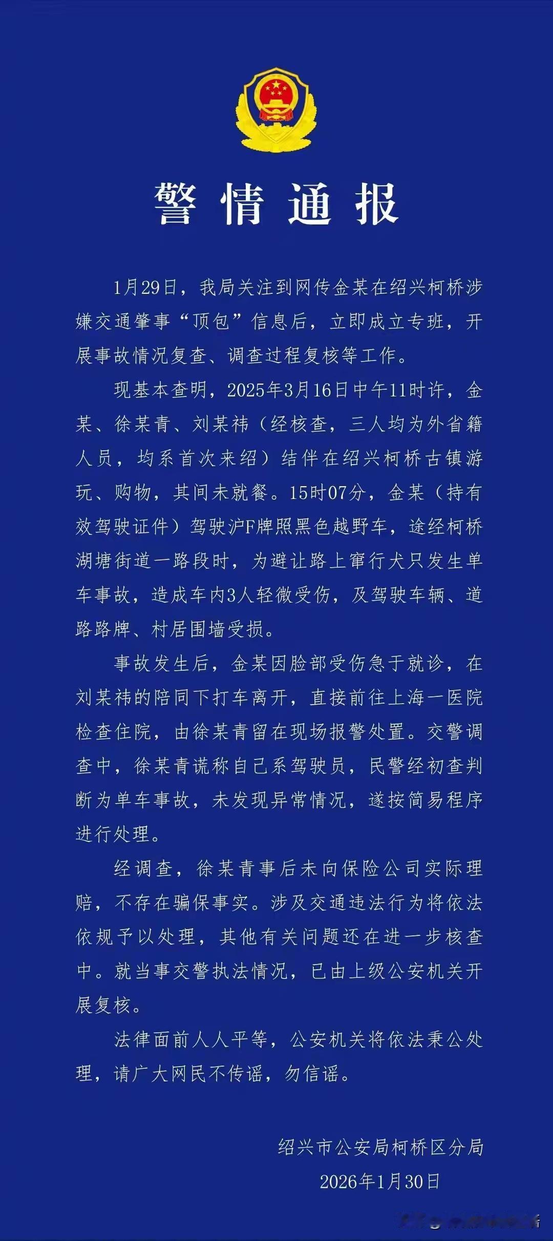 #金晨一行三人首次到绍兴#【#上级机关复核金晨事故当事交警执法#】1月30日,