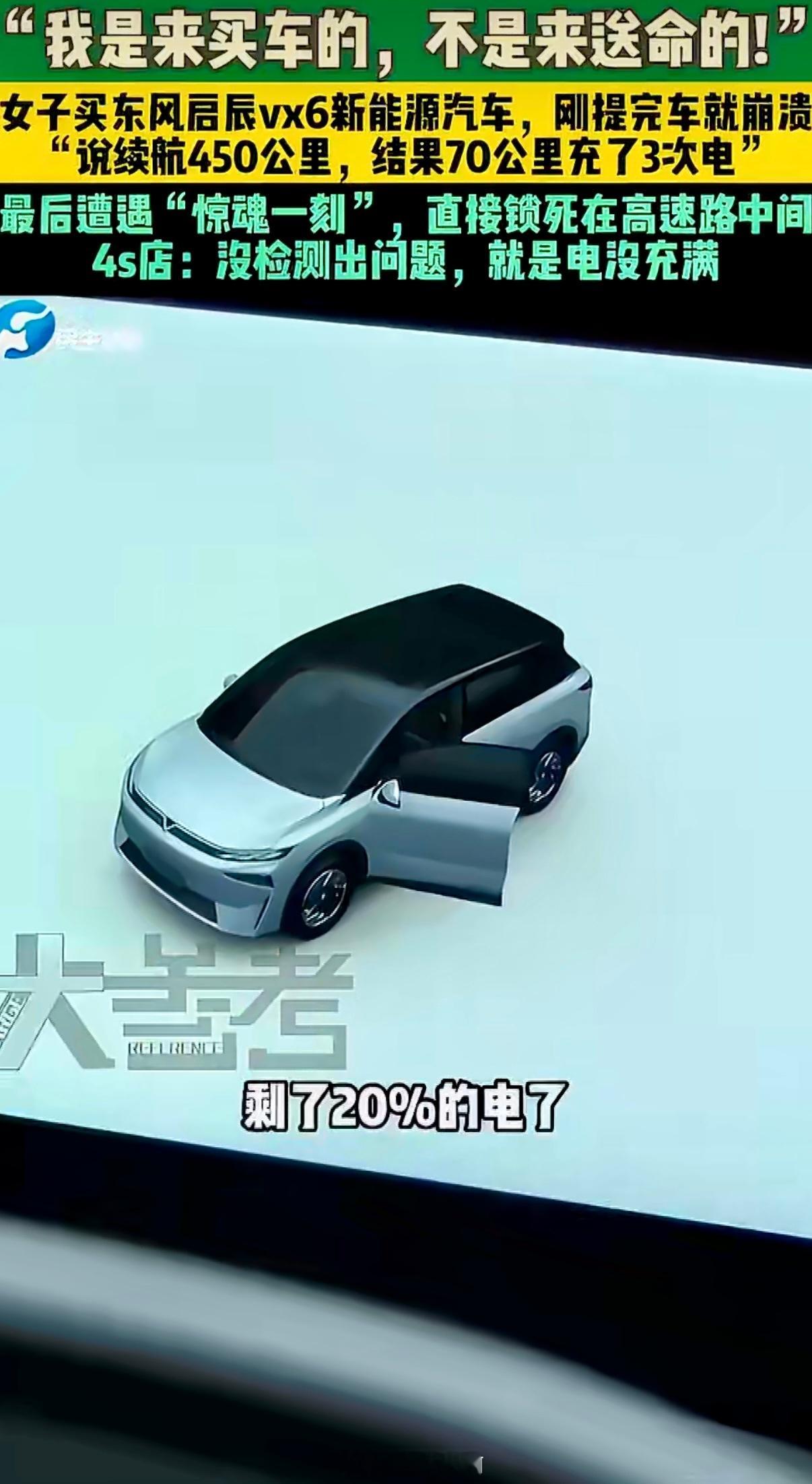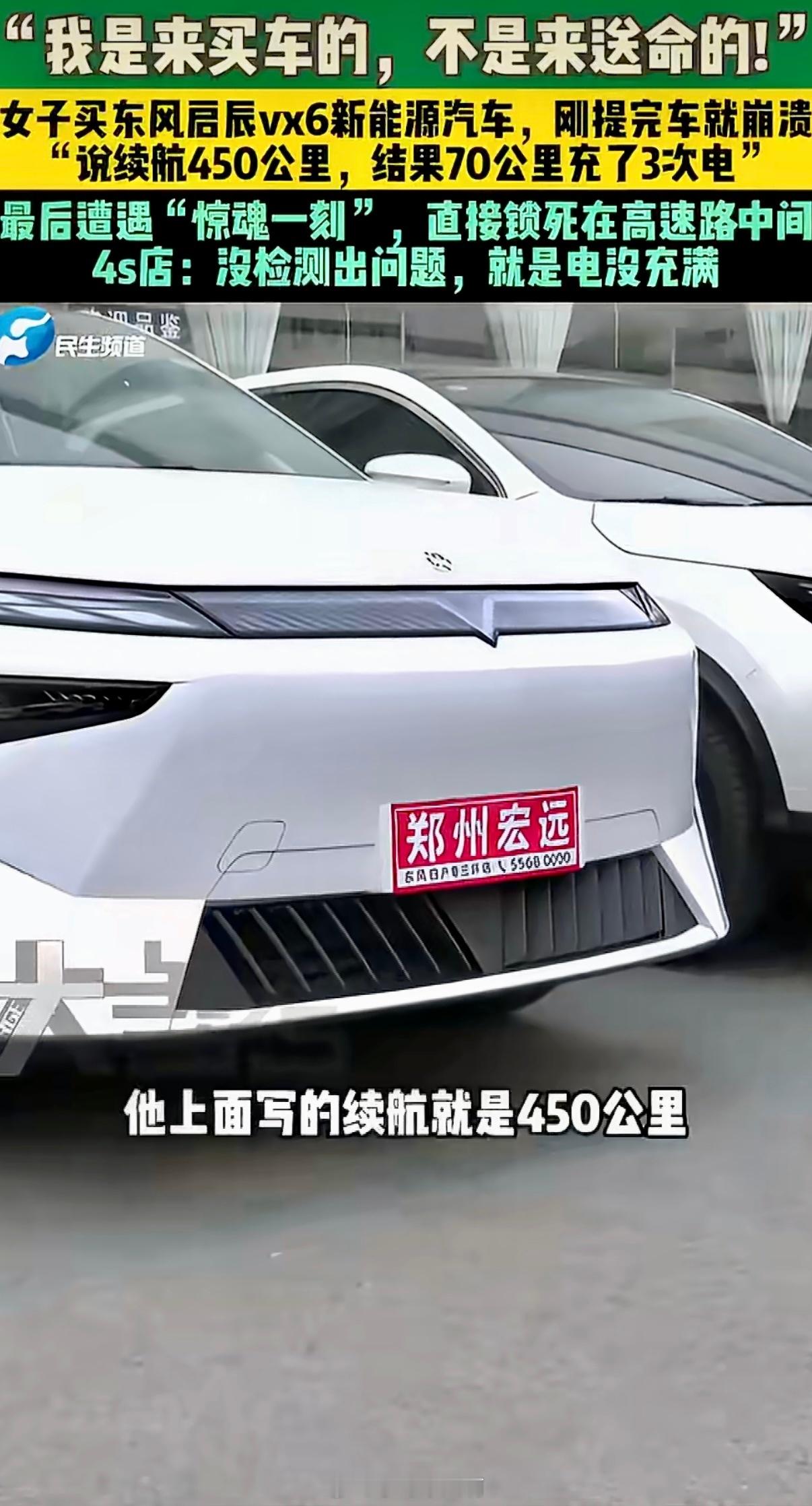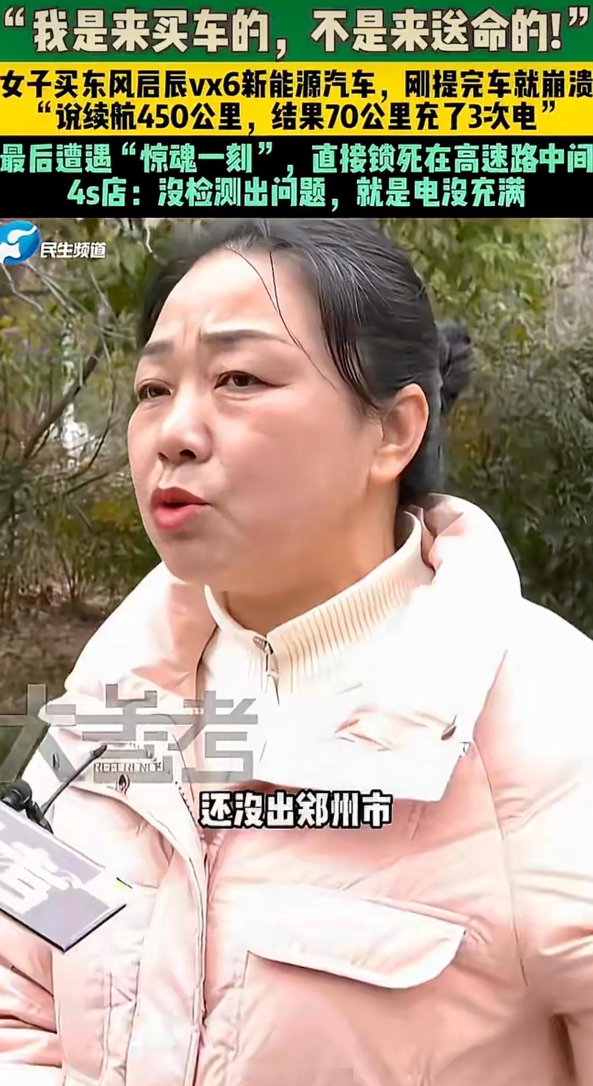 河南郑州一位女士刚提了新车,还没来得及高兴就彻底崩溃了——宣传续航450公里的新能源车,结果上路才跑了70公里,竟然被迫充了3次电!更吓人的是,车子最后直接在高速路中间“罢工”锁死,把她一个人困在车流中,惊魂未定地喊出:“我是来买车的,不是来送命的!”女子买新能源车频繁充电还卡在高速
