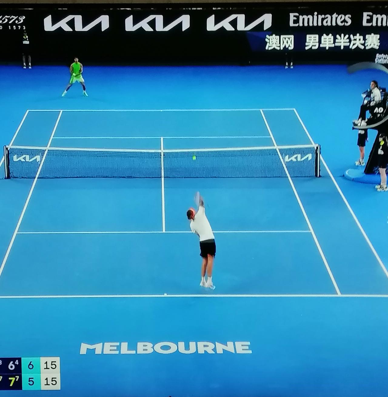 这场澳网半决赛实在是精彩之至! 今天澳网男单第一场半决赛,从上午打到傍晚时分,历经整整5个半小时才分出胜负。一号种子阿尔卡拉斯极惊险地以3:2战胜小兹维列夫,挺进决赛。 五盘比赛中就有三盘抢7大战!比赛跌宕起伏,惊心动魄。观众先是以为兹维列夫要输,再后又以为阿尔卡拉斯将被淘汰,最后时刻,兹维列夫体力明显不支,才让阿尔卡拉斯占据了上风,笑到了最后。 这场比赛的现场观众很幸运,这张球票太划算了,看了5个半小时的精彩比赛。 这场比赛是一号种子与三号种子的交锋,双方势均力敌,难分伯仲。比赛最后比的是体力和毅力。阿尔卡拉斯胜在了体力上面。