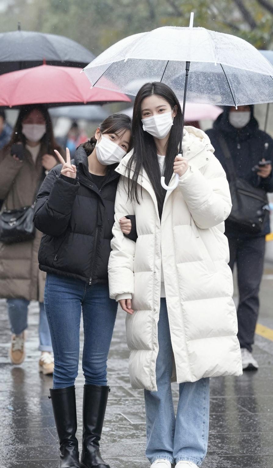 雨中漫步,白色羽绒服保暖又时尚,撑起透明伞,享受雨天漫步的浪漫。🌧️👗💕