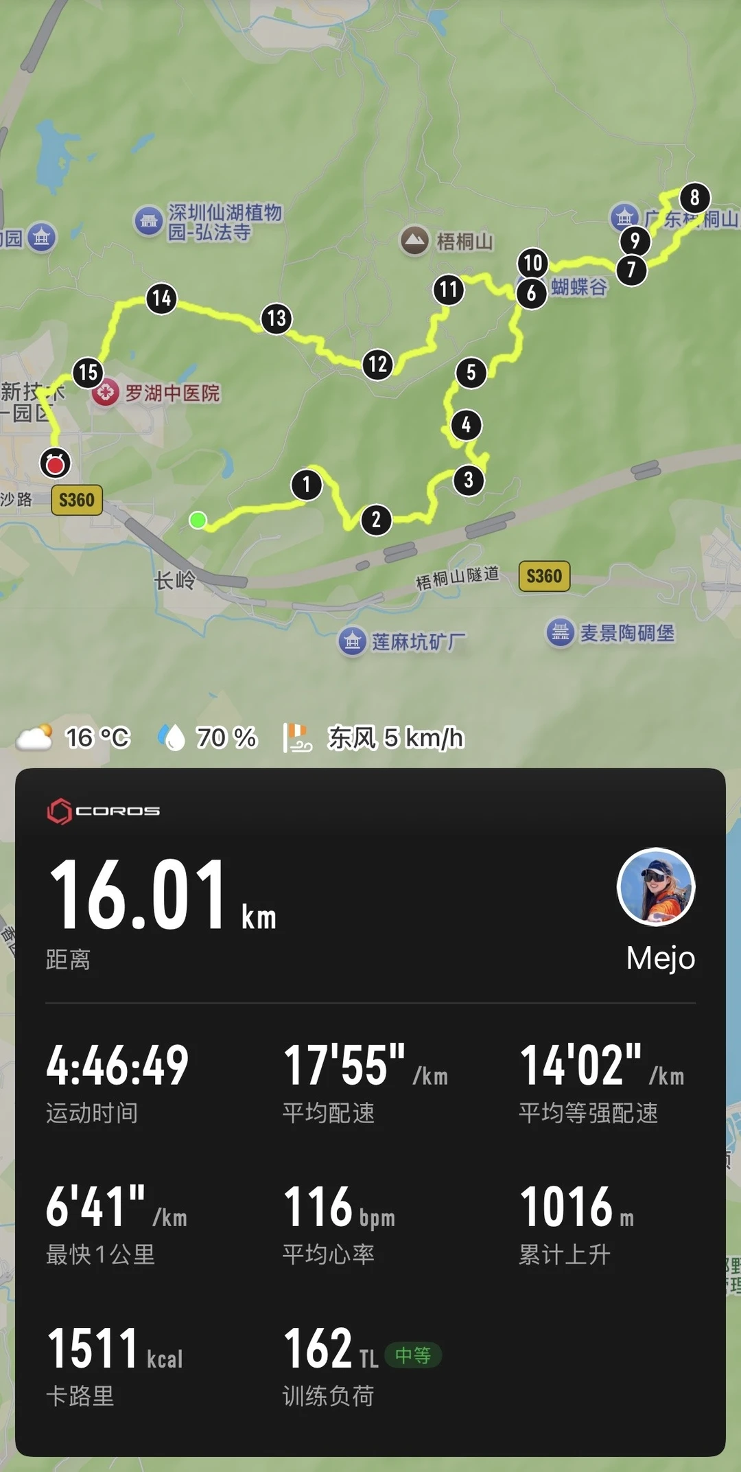 路线:地铁8号线梧桐山南 D口→牌坊盘山路蝴蝶谷→好汉坡→大梧桐→下撤小梧桐→登云道→终点地铁2 8线莲塘 全程16km公里✅