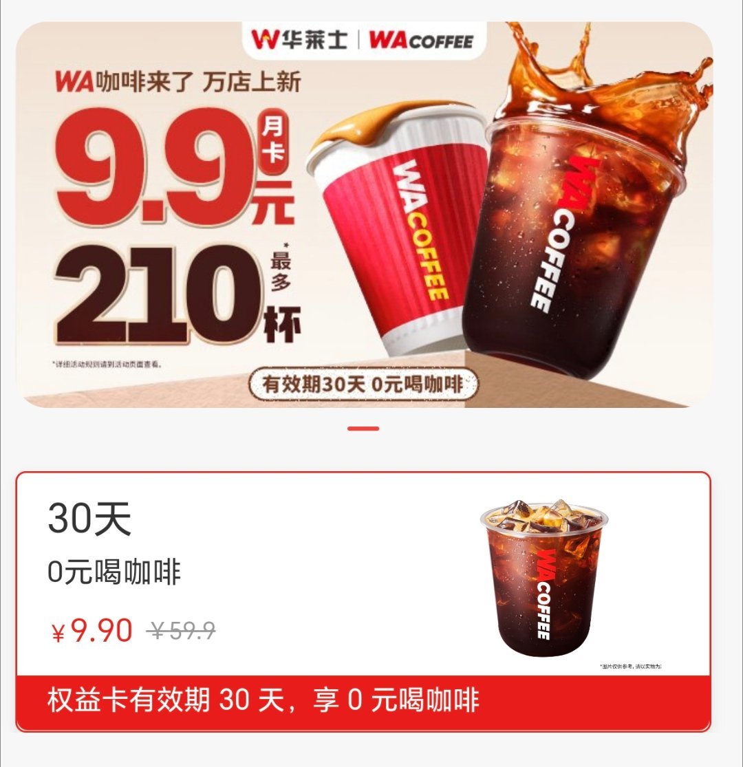 咖啡价格被华莱士打下来了艹,太狠了,9.9不是一杯,而是一个月。每2小时可以点一杯?虽然得在门店200米范围并且营业,但就算每天一杯,这个价格也已经无敌了啊。下一个是谁会跟上。卷出天际。虽然应该也不咋好喝
