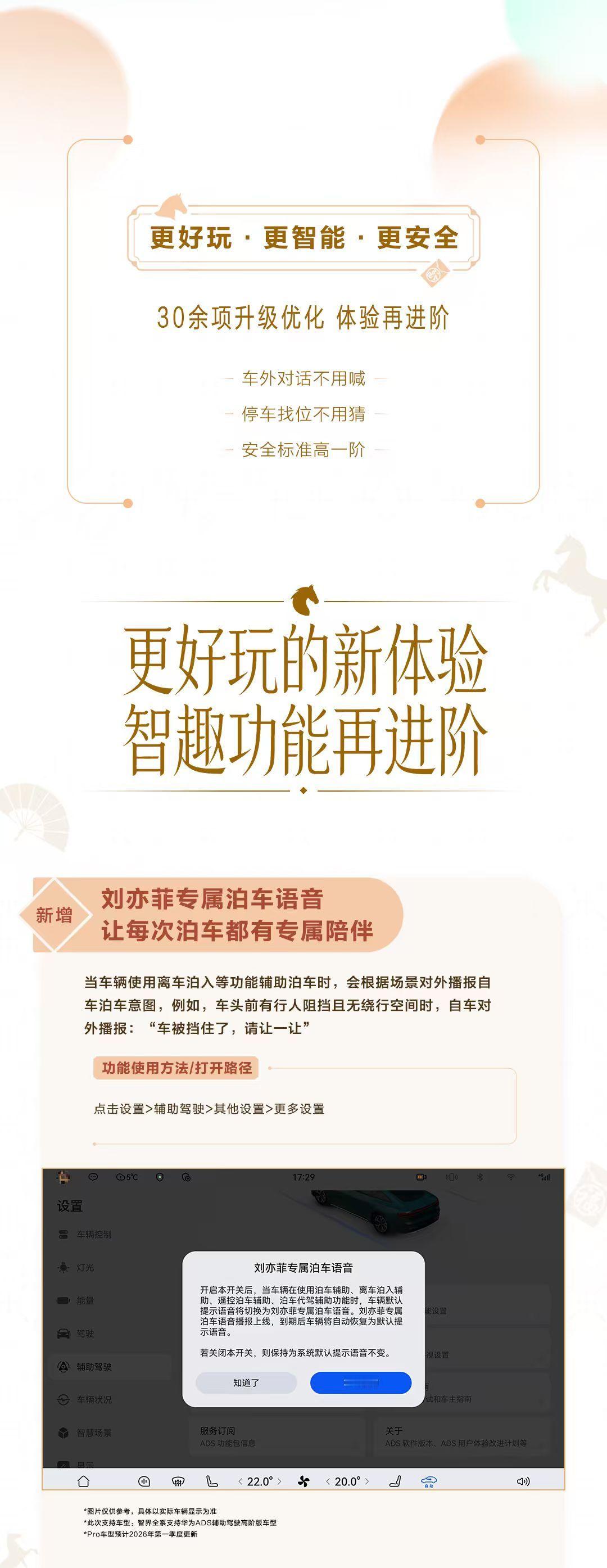 智界这一波新年开门红OTA升级,刘亦菲语音包也上车了,真是好羡慕啊。智界车主王玉雯在社交平台分享她的冬日出行体验,作为“刘亦菲迷妹”,抢鲜体验了本次OTA升级后的多项功能,辅助泊车触发了刘亦菲专属语音包。还要假装没挺好,再听一遍,哈哈哈。话说最近智界的新春福利也很大,2月2日前完成下定全系可享至高12000元新春购置税补贴。全系现车可提,还有几天时间,抓住机会~王玉雯 假装车没停好听了两遍刘亦菲语音包上车