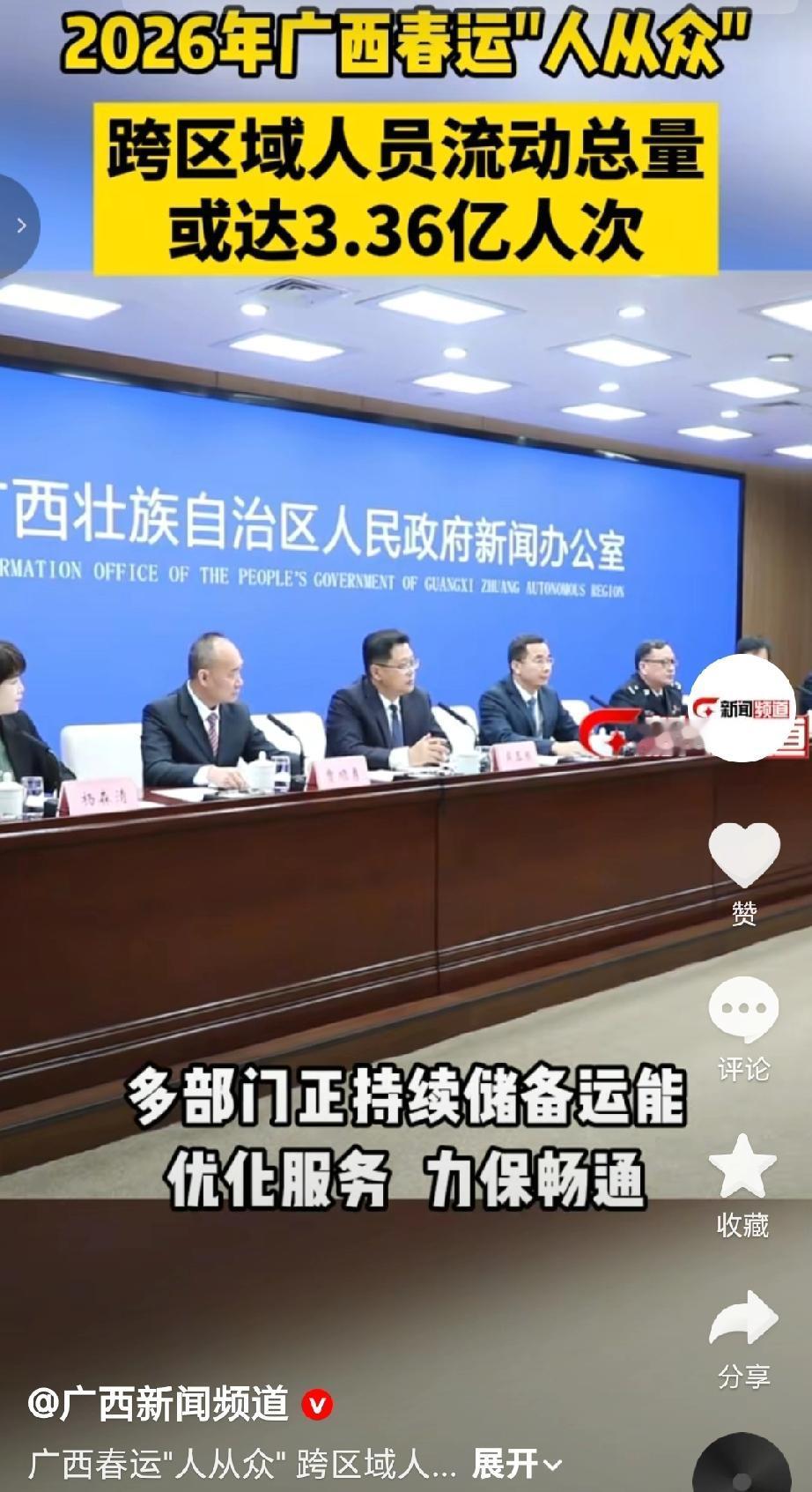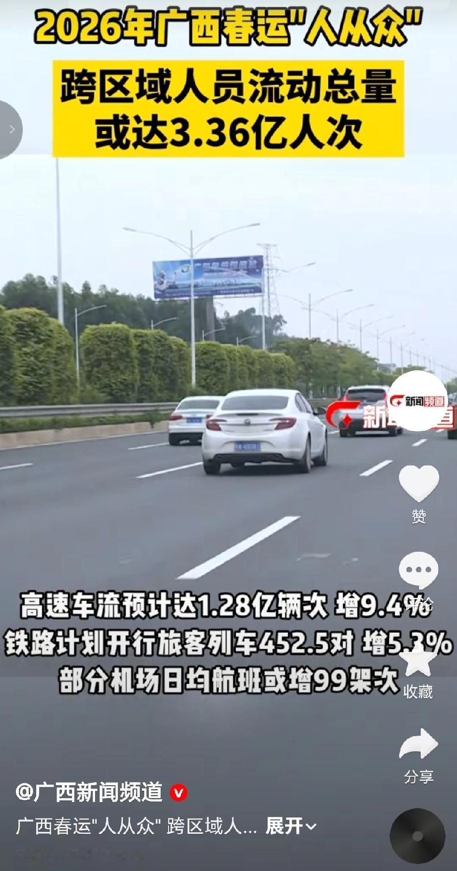 广西春运将于2026年2月2日启动,至3月13日结束,共40天。预计全社会跨区域人员流动总量达3.36亿人次,其中春节假期达1.29亿人次,营业性客运总量预计4423万人次,多项数据将创历史新高,节前务工返乡高峰为农历腊月二十六至二十八(2月13日至15日);节后务工返岗与旅游客流叠加高峰为正月初六至初八(2月22日至24日)。道路运输预计投入1.9万辆客车,发送175万班次;高速公路出入口车流量预计1.28亿辆次,新能源汽车出行量增长显著,正月初六(2月22日)或为车流最高峰。(来源于@广西新闻频道 )