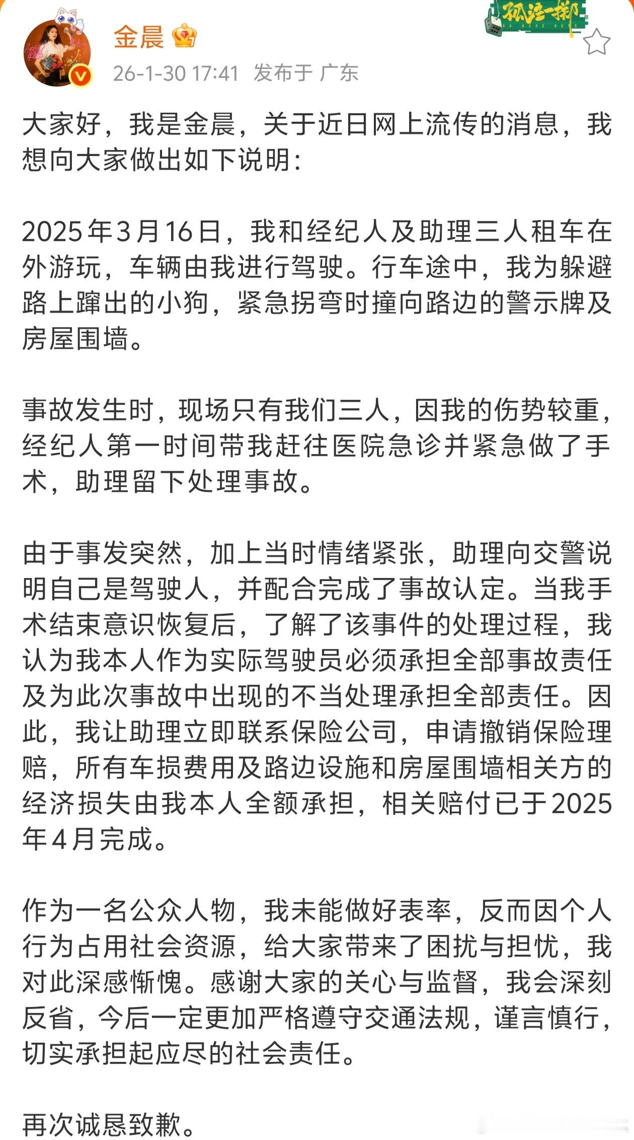 关于撤销保险理赔,金晨解释了原因,了解了事故全过程,所以选择个人承担全部赔付责任。而非由保险公司承担。相关赔付已于去年4月完成。