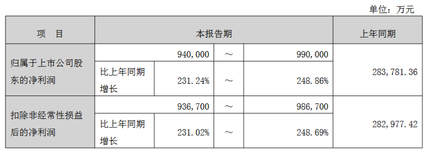 1月30日,新易盛(300502)发布公告,公司预计2025年归母净利润94亿元至99亿元,同比增长231.24%至248.86%,具体数据如下: