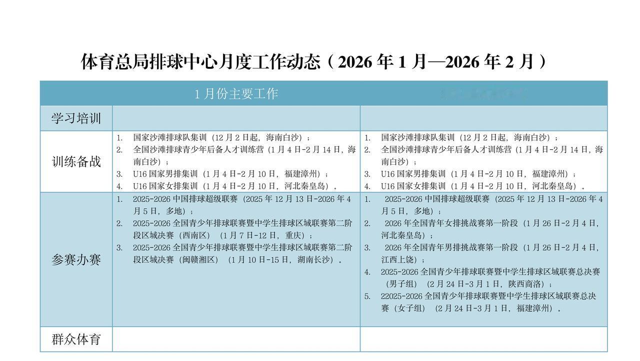 【排管中心2月份工作计划】 训练备战主要是U16和沙排集结 办赛就是排超联赛和全国青少年挑战赛 以及全国中学生排球联赛 话说那个22025是认真的么? 做表的行政人员得扣绩效~