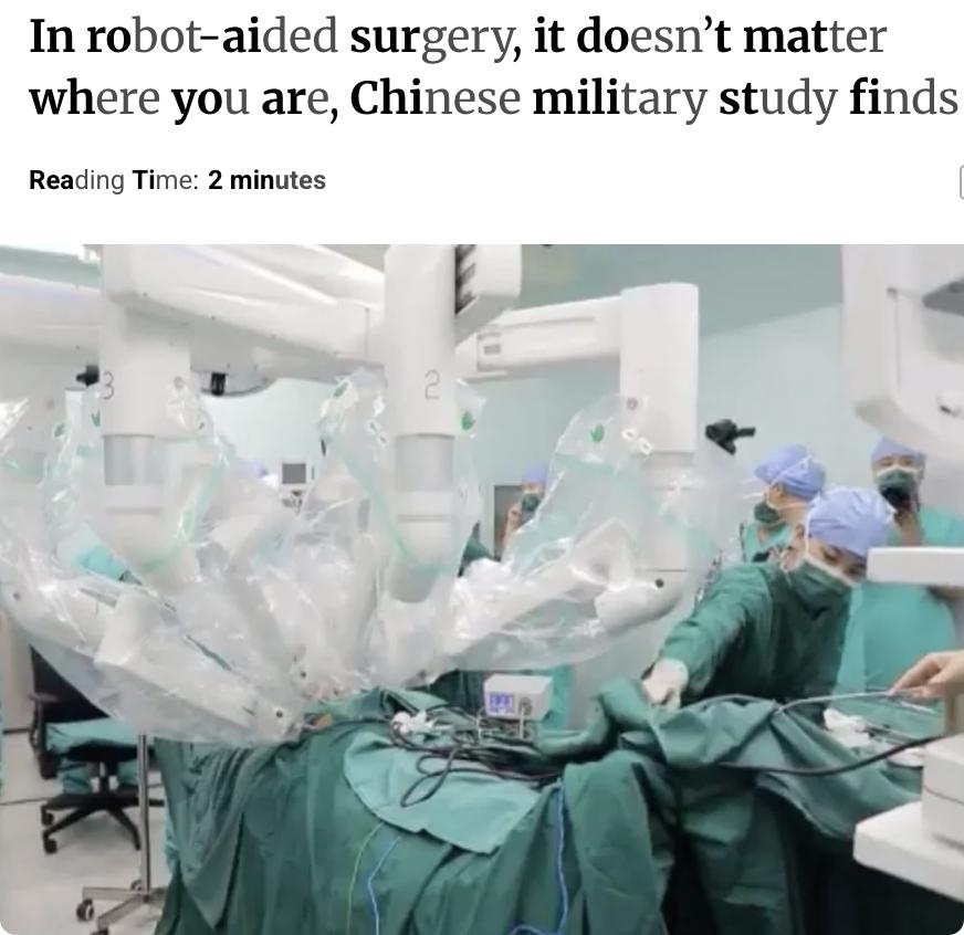 外媒:中国军事研究人员主导的一项新研究发现,远程机器人辅助手术与医生在同一房间进