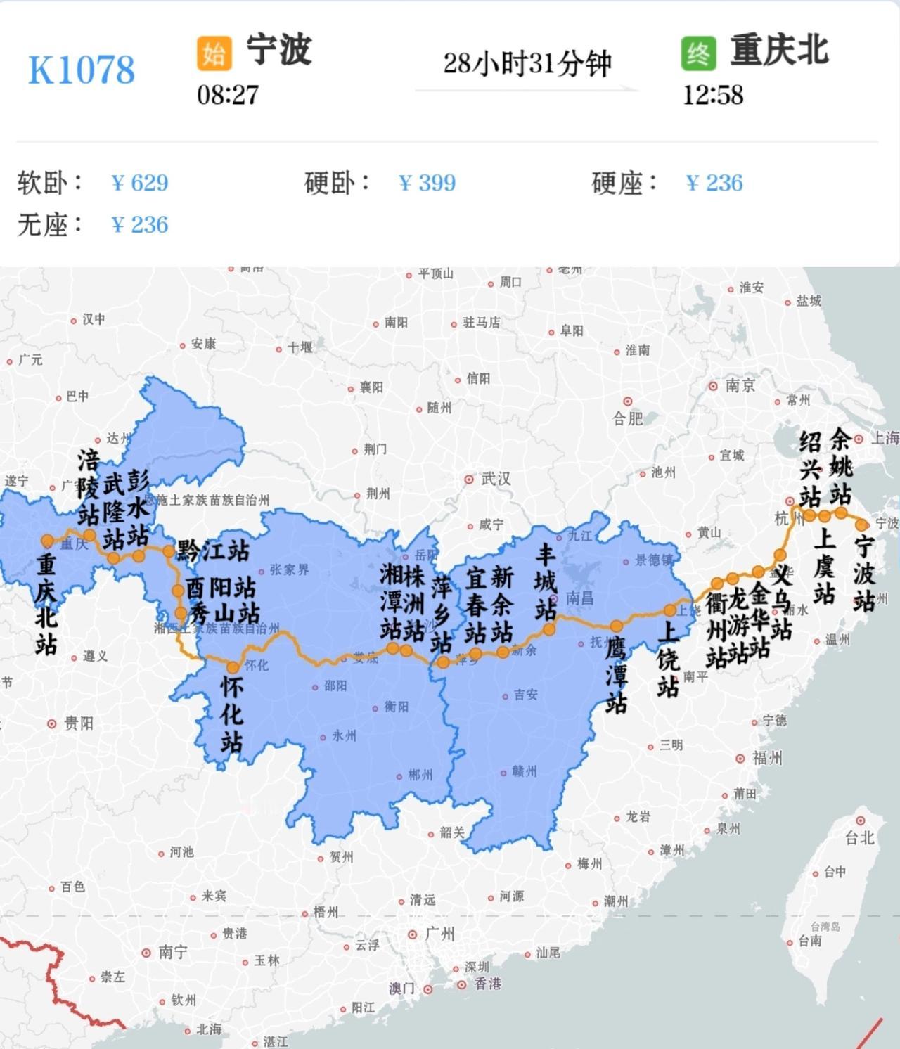 宁波到重庆唯一一趟图定绿皮火车:K1078/K1075次,宁波站8点27分开,第二天12点58分到重庆北站,用时28小时31分钟。