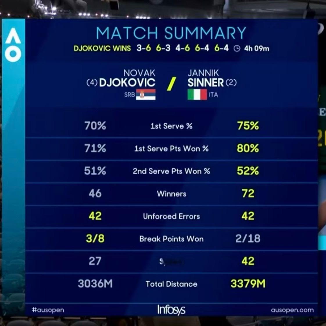 赛季技术统计,辛纳几乎全面领先,意大利人总得分152,远超德约的140分!两人UE都是42,但辛纳Winner72比46。这场球德约完全就是胜在关键分!对破发点的把握和挽救~