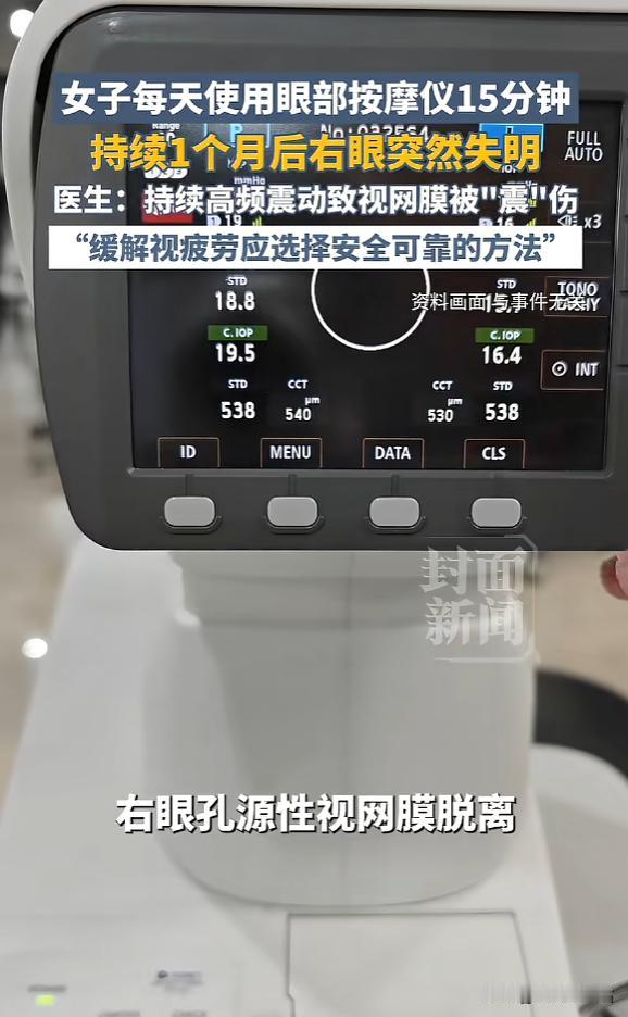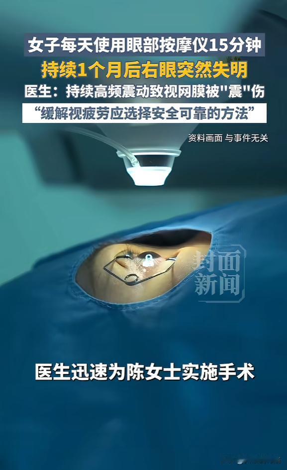 “悲剧还是发生了!”福建福州,一女子因失眠导致眼睛疲劳,为了缓解不舒服,她每天都用15分钟眼部按摩仪,没想到用了一个月后,她的右眼突然看不见,医生检查后她才知道自己的视网膜已经脱离,在严重点就失明了!网友:吃了没常识的亏! 福州这位57岁的陈女士,是在一个很普通的早晨发现不对劲的。 起床后她像往常一样睁眼、看周围,结果突然意识到,右眼几乎看不到东西:不是“有点花”,也不是“雾蒙蒙”,而是明显的视野缺失,甚至接近一片黑。 没有撞到哪里,也没有明显外伤,这种“突然看不见”的冲击,让人很容易慌掉,很多人第一反应都会是:是不是脑子出问题了,是不是眼睛突然坏了。 她很快去医院就诊,医生检查后给出的诊断是孔源性视网膜脱离,并伴有眼球挫伤相关表现。 对普通人来说,这几个词听上去很陌生,但意思其实很直白:视网膜出现裂孔,裂孔附近的液体,进入视网膜下方,把本应贴在眼底的一层“感光组织”顶起来、掀起来,导致视功能迅速下降。 如果脱离范围扩大或拖延时间过久,视力可能难以恢复,甚至永久失明。 这件事并不是她“突然做错了什么”,而是一个月里逐步累积出来的风险,陈女士长期失眠,加上退休后,手机使用时间偏长,眼疲劳明显。 一个月前,她买了一台号称“高频震动”的眼部按摩仪,想着每天按一按,放松眼周肌肉、缓解干涩和酸胀,也希望对睡眠有帮助,她使用得很规律:每天约15分钟,坚持了一个月左右。 她自己回忆,使用时会把仪器贴在眉弓,或眼眶周围的位置,很多这种产品在设计上,会强调“贴合眼周”“震动舒缓”,使用时的感觉,也确实容易让人产生错觉:酥麻、温热、松弛,像是肌肉被“按开了”。 这种即时的舒适感,会让人放下戒备,甚至越用越依赖——觉得眼睛酸就按一按,睡不着也按一按,不知不觉把它当成日常保健。 问题在于,眼睛不是肩颈,眼眶骨虽然硬,但它并不能完全隔离震动的传导,高频震动可能通过骨性结构和软组织传到眼球。 眼球内部的结构非常精细:玻璃体、视网膜、黄斑这些部位对牵拉和冲击都比较敏感。 尤其是中老年人,玻璃体本身就容易发生变性、液化、后脱离等变化,一旦外力反复震动、反复牵拉,就可能增加视网膜裂孔和脱离的风险。 可以把视网膜,理解成“贴在眼底的一层很薄的膜”,它需要稳定的贴附状态,一些反复的机械刺激,虽然每次力度看起来不大,但频率高、持续时间长,就可能把风险慢慢堆起来。 对高度近视人群来说,这个风险还会更高一些,因为眼轴更长、视网膜更薄,本来就更容易出现周边变性、裂孔,医生通常会建议避免剧烈震动、强冲击的运动或行为。 陈女士算是比较幸运的一类:她发现异常后及时就医,赶上了手术干预的窗口期,视网膜脱离的治疗,往往需要根据范围和裂孔情况做激光封孔、充气复位或玻璃体切割等处理,越早处理,保住视力的概率越大。 相反,如果拖延,视网膜脱离时间越长,视细胞受损越重,即使“复位成功”,视力也可能回不到原来的水平。 这件事带出的现实提醒也很明确:市面上的护眼产品,不等于适合所有人,更不等于可以长期、每天固定使用。 尤其带“震动”“揉压”“敲击”这类机械刺激的设备,用在眼周要格外谨慎,如果本身有高度近视、飞蚊症突然增多、闪光感、视野像被“窗帘遮住”、或眼底检查提示有视网膜变性的人,更应该避免这类刺激,并定期做眼底检查。 至于日常更稳妥的护眼方式,确实往往不复杂,减少连续近距离用眼、做远眺休息(比如常说的每用眼一段时间就看远处一会儿)、保持室内光线合适、控制屏幕亮度、必要时用温热敷缓解干涩,比“靠机器震一震”更安全。 热敷通常强调温度不要过高、时间不要过长,感到温热舒适即可;如果有眼部炎症、眼压问题或其他眼病史,最好先咨询医生再做。 这类案例最可怕的地方,不在于“突然失明”,而在于它往往发生在“你觉得自己在保养”的过程中,眼睛出了问题,很多时候不是靠更“猛”的刺激去解决,而是靠更温和、更有边界的习惯去保护。 信源:《女子每天使用眼部按摩仪15分钟,持续1个月后右眼突然失明。医生:持续高频震动致视网膜被"震"伤,“缓解视疲劳应选择安全可靠的方法”》封面新闻