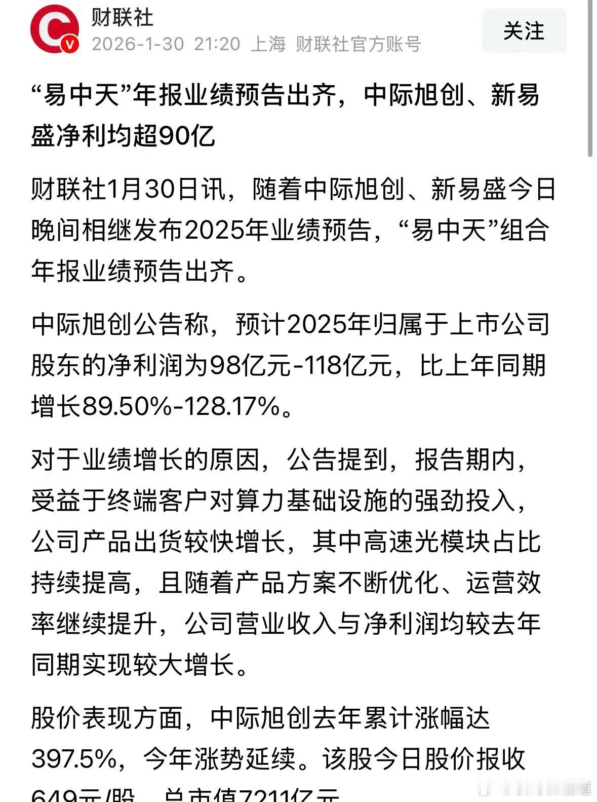 重磅利好消息A股光模块CPO赛道“易中天”业绩曝光,新易盛大超市场预期:重磅利好消息,2026年1月30日,截至今晚,新易盛、中际旭创、天孚通信2025年度的业绩全部出来了,整体超预期,其中新易盛、中际旭创大超预期:
