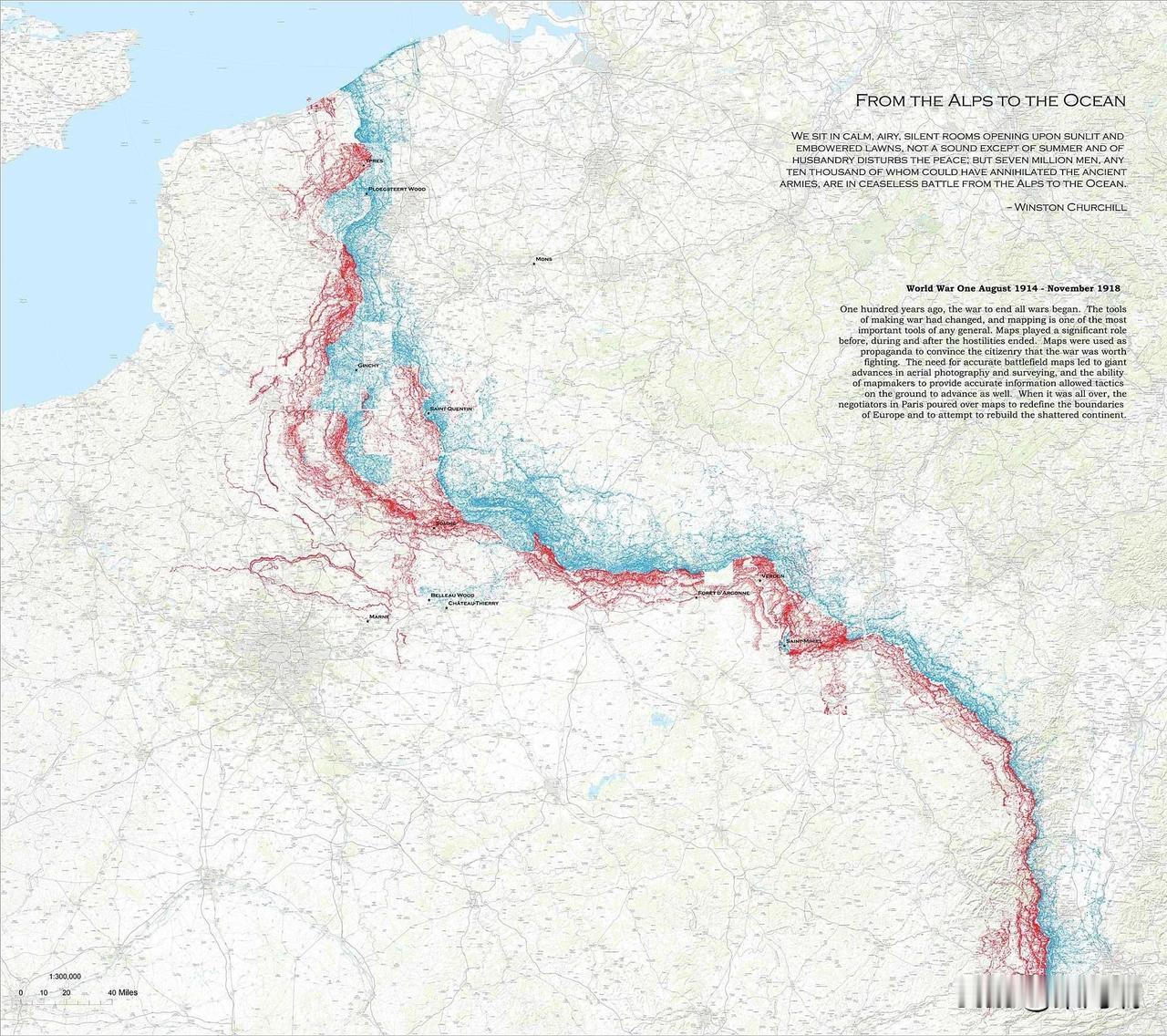 这是一幅展示第一次世界大战西线战壕系统的详细地图。地图标题“FROM THE ALPS TO THE OCEAN”(从阿尔卑斯山到海洋)源自温斯顿·丘吉尔(Winston Churchill)的一句名言。 地图详情 描绘内容: 这幅地图采用详细的制图可视化技术,描绘了1914年8月至1918年11月期间,从北海海岸延伸至瑞士边境的盟军(红色线条)和德国(蓝色线条)的战壕网络。 第一次世界大战期间,西线战事迅速演变成一场残酷的僵局,双方构建了复杂的防御工事,形成了数百英里长的战线,而这条战线在大部分时间里几乎没有移动。 该地图是哈佛大学地图馆2014年举办的名为“从阿尔卑斯山到海洋:西线地图”展览的核心展品,展示了这场塑造了现代欧洲的冲突的巨大规模。 地图上的引文描述了战争的超现实对比:“我们坐在宁静、通风、寂静的房间里,窗外是阳光明媚、绿树成荫的草坪,除了夏日和农耕的声音,听不到任何其他声音;但是七百万士兵,其中任何一万人就可以歼灭古代军队,正在从阿尔卑斯山到海洋进行着永无休止的战斗。”