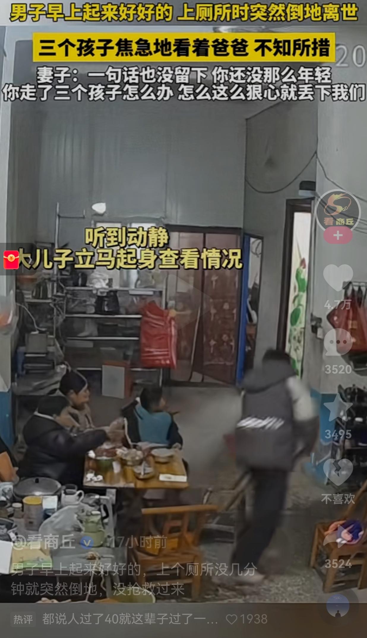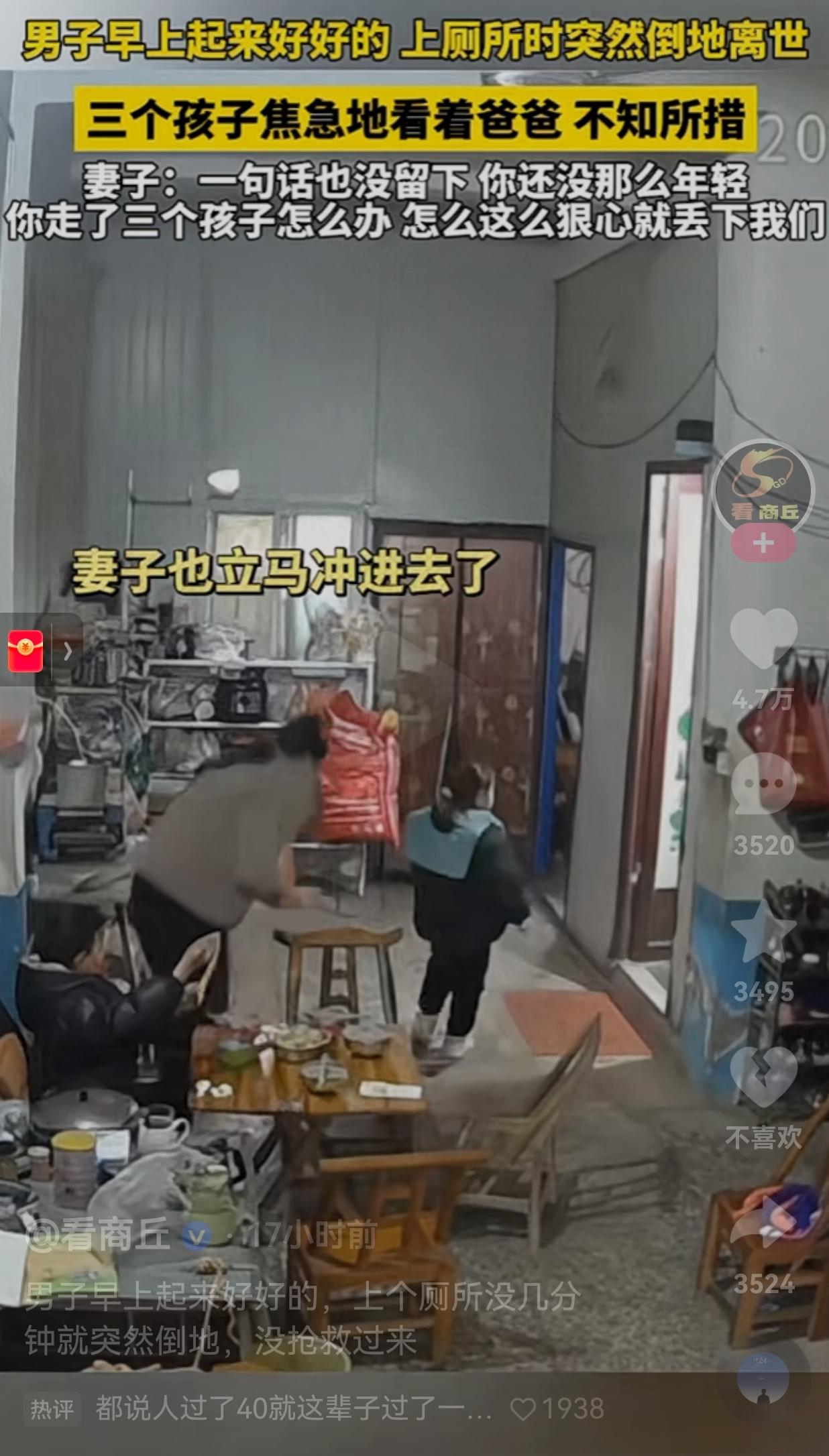 看的人心里揪得慌!一个普普通通的清晨,一家人围坐在餐桌前吃饭,男人放下碗筷起身去上厕所,这看似再平常不过的一幕。 谁能想到,这竟是他留给妻儿的最后一个背影。 男子在厕所里,突然重重地摔了下去。 孩子们听见动静,大儿子第一个冲过去查看,男孩呼喊爸爸没有反应,又出来丈夫妈妈看看爸爸怎么了? 妻子看到情况不对劲,也紧跟着跑过去,三个孩子围在门口,小小的脸上写满了焦急和不知所措。最终,男人没能抢救回来,一句话也没留下,就这么走了。 妻子撕心裂肺的哭喊,隔着屏幕都能让人掉眼泪:“你还没那么年轻,你走了三个孩子怎么办?怎么这么狠心就丢下我们……” 此事传到了网上,引发无数网友的共鸣,有的网友说:“看到这个视频突然鼻子就酸了,我也是家里的顶梁柱,平时总觉得年轻扛得住,现在想想真后怕。” 还有的网友说:“看到孩子们围着门口不知所措的样子,我心都碎了。女人们啊,别光盯着孩子和家务,也多看看身边那个默默扛着的男人吧。” 我特别能理解家人的这种无力感。这个男人不是什么大人物,但是,他是孩子的父亲,是妻子的丈夫,更是一个家庭的主心骨,他这一去世,整个家就轰然倒塌了! 所以说,为了自己的身体着想,该体检就体检,该休息就休息,千万别为了省钱而透支自己的身体。 到那时,说什么都晚了!除了给家人带来无尽的伤害之外,什么也做不了了。 大家觉得呢?欢迎大家评论区讨论留言。