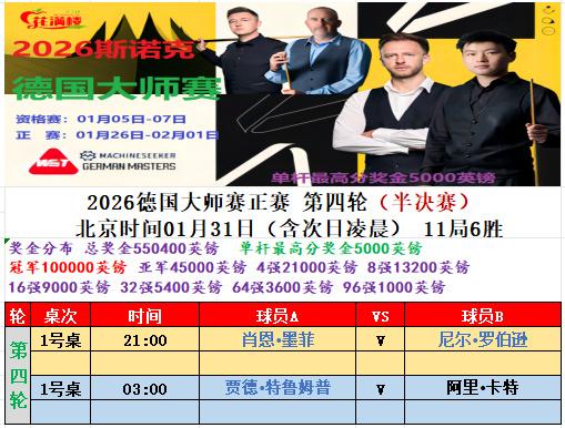 很遗憾,中国球员再次卡八!肖国栋3-5不敌世界第一止步德国大师赛八强!26年斯诺克德国大师赛四强对阵: 特鲁姆普—卡特 墨菲—尼尔罗伯逊