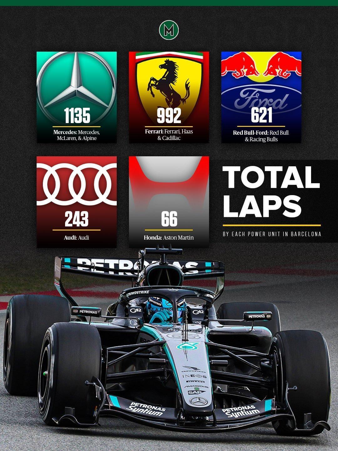 f1巴塞罗那试航周11支车队以及五个动力单元供应商里程数,梅赛德斯完成了500