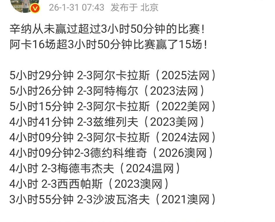 辛纳从未赢过超过3小时50分钟的比赛! 阿卡16场超3小时50分钟的比赛赢了15场! 其实很说明问题了,辛纳节奏太过单一,虽然技术层面顶得没得说,但是他的确没有planB,体能和阿卡相比还是有差距。