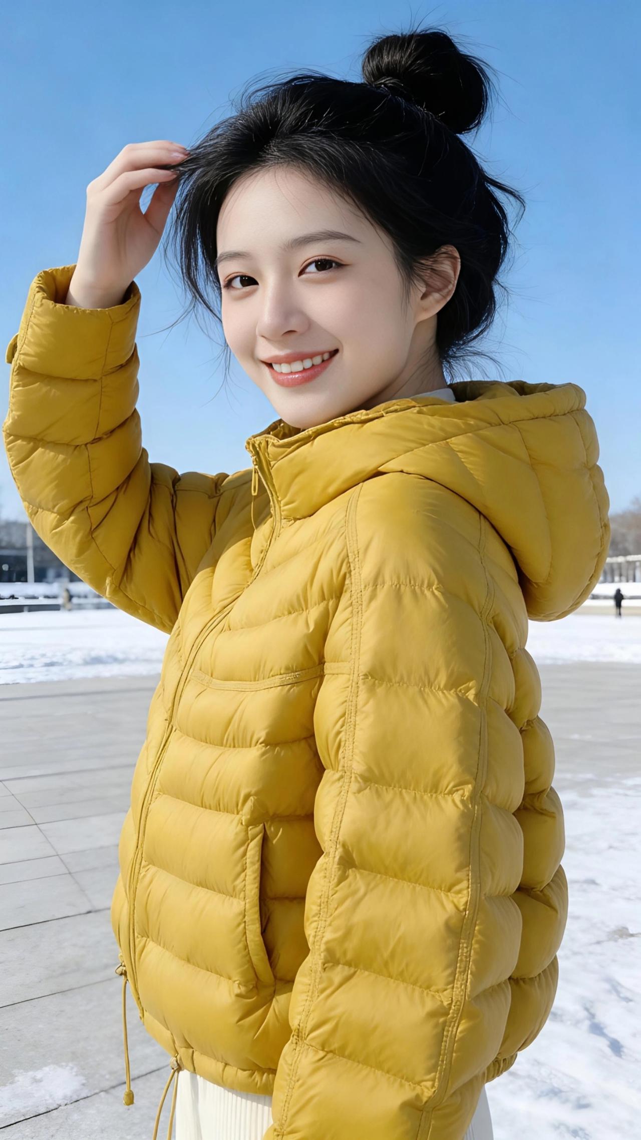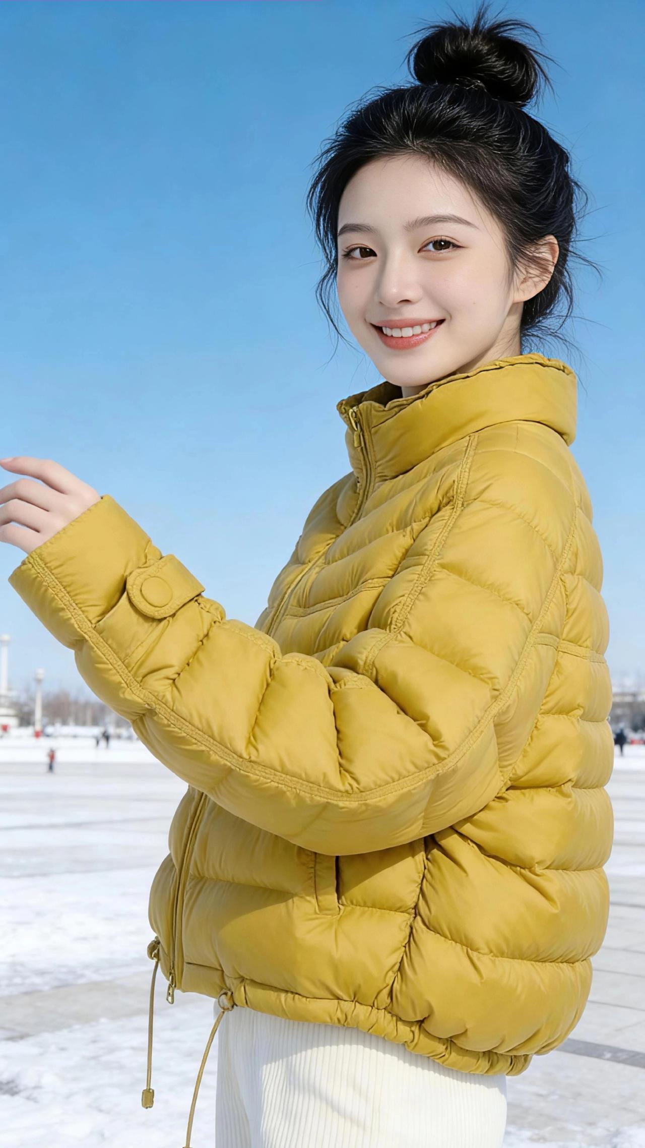 冬阳下的黄羽绒 雪后的广场是被蓝天框住的一块冰玉,风里浮着细碎的雪粒,落在衣领上便化出一点凉。她站在这亮得晃眼的天地间,像从冬阳里裁下的一团暖。 蓬松的丸子头沾了星子似的雪屑,发梢在风里轻轻晃着,衬得一张脸愈发白皙。姜黄色的羽绒服裹着她的肩背,细密的绗缝里填着满满的暖意,立领竖起时,恰好挡住了风的来路。阳光顺着衣料的纹路漫开,把每一道褶皱都烘得暖融融的,下摆的抽绳随着她抬手的动作轻轻晃着,漾起一圈温柔的弧度。 她笑着比出“V”字,梨涡浅浅,阳光落在羽绒服的绒面上,泛着细腻的光泽。侧身时,衣摆扫过雪地,惊起细碎的雪沫,她便笑着旋开去,像一只在雪光里振翅的小黄鹂。偶尔抬手撩一下额发,羽绒服的帽子顺势滑下,露出内里柔软的衬里,在明黄与雪白的撞色里,添了几分随性的娇俏。 这不是凛冽的寒冬,是被一件羽绒、一抹笑靥焐热的冬日。她站在雪与光的中央,让风都变得温柔,让路过的人都忍不住放慢脚步——原来最冷的季节里,一件暖衣、一个笑容,就足以把日子过成诗。 高级感穿搭 新年穿搭 冬季穿搭 棉衣棉服
