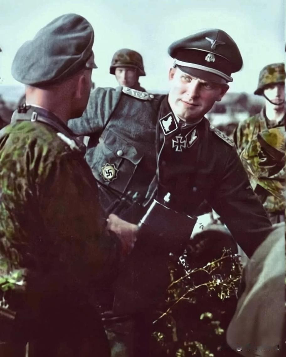 武装党卫军第1“阿道夫·希特勒警卫旗队”装甲师第二任师长提奥多·威施,照片拍摄于1943年“堡垒行动”期间。1943年7月,威施接替约瑟夫·迪特里希,成为“警卫旗队”师师长。1944年8月,他在诺曼底法莱斯包围圈中身受重伤,失去双腿,从而结束了其前线指挥生涯。战后,他被盟军俘虏并关押至1948年。获释后,他度过了一段相对平静的晚年,于1995年在德国去世。照片中其制服领章上的两片橡树叶显示他当时担任党卫军区队长(不对应国防军任何军衔)。他颈间佩有骑士十字勋章,右胸口袋处可见一枚德意志十字勋章。 二战德国人物 德国将领 德国装甲部队 历史 历史老照片 二战