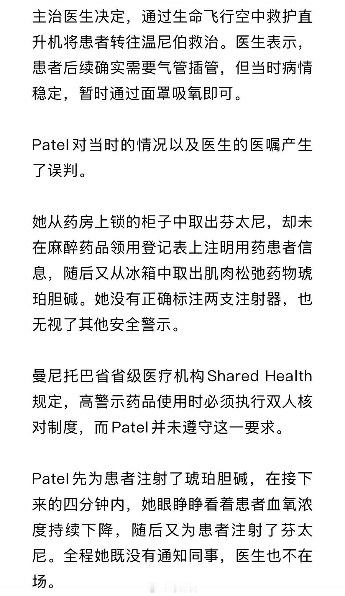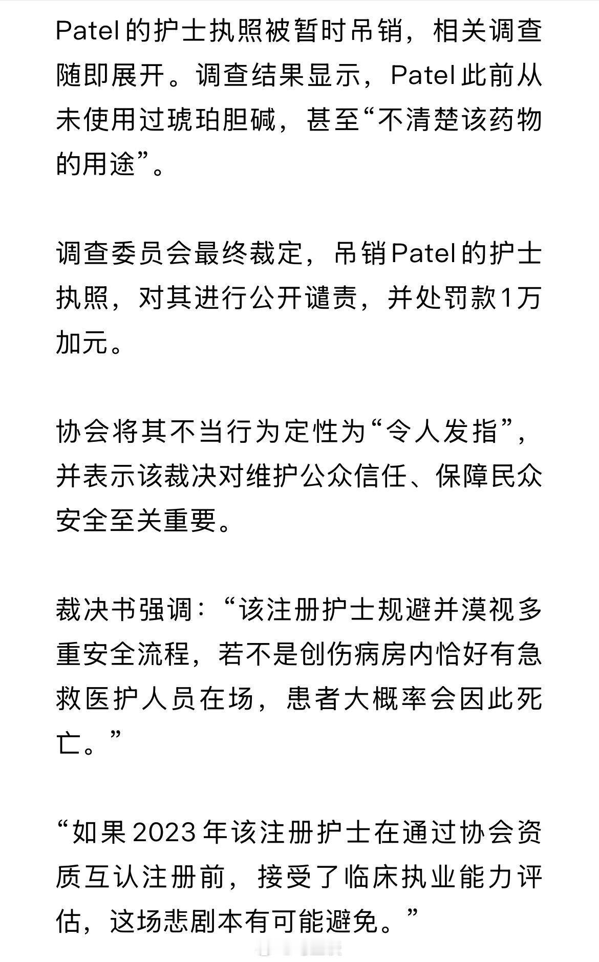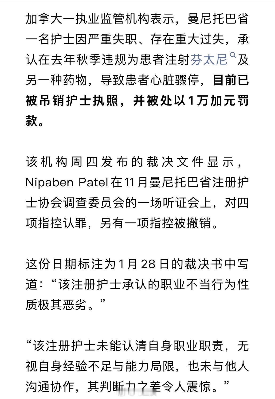 离谱!加拿大印度裔护士给患者违规注射芬太尼和琥珀胆碱,导致患者心跳骤停。为了掩盖违规真相,竟还想让医生补开注射医嘱。她曾在印度从业13年,最终她的护士执照被吊销……