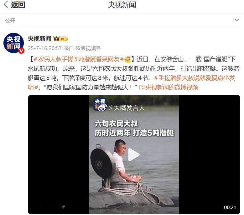 昨天对岸蛙军的所谓潜艇海鲲号,再次尝试潜入水下,引来绿媒一遍叫好(图1)让我想起图2我们央视的新闻,去年一位安徽大叔,手搓了一条5吨重的潜艇,下潜了5米水深热点观点 ,台海鲲号被爆无锚海试 ,台自造潜艇海鲲号被曝船身变形