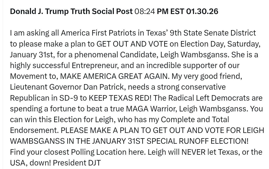 特朗普:我呼吁德克萨斯州第九州参议院选区所有“美国优先”的爱国者们,请务必在1月31日(星期六)选举日当天出门投票,支持杰出的候选人莉·瓦姆斯甘斯 (Leigh Wambsganss)。她是一位非常成功的企业家,也是我们“让美国再次伟大”运动的坚定支持者。我的好朋友,副州长丹·帕特里克 (Dan Patrick),需要一位强大的保守派共和党人在第九州参议院选区站稳脚跟,以确保德克萨斯州继续保持共和党的统治地位!激进的左翼民主党人正在不惜重金,试图击败真正的“让美国再次伟大”战士莉·瓦姆斯甘斯。莉得到了我的全力支持,你们可以赢得这场选举。请务必在1月31日的特别决选中出门投票,支持莉·瓦姆斯甘斯!点击此处查找离您最近的投票站。莉·雷绝不会让德克萨斯州或美国失望!——特朗普总统