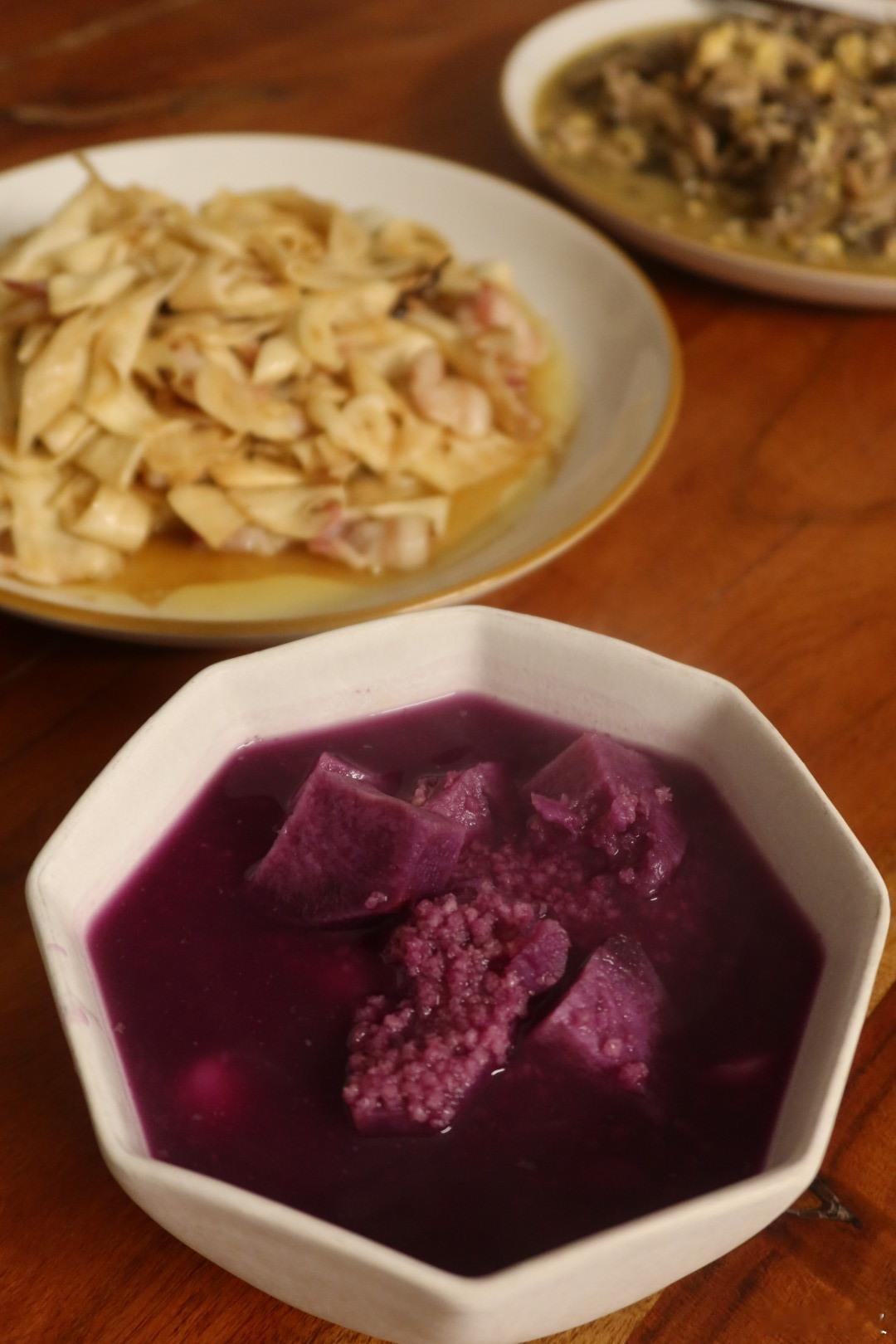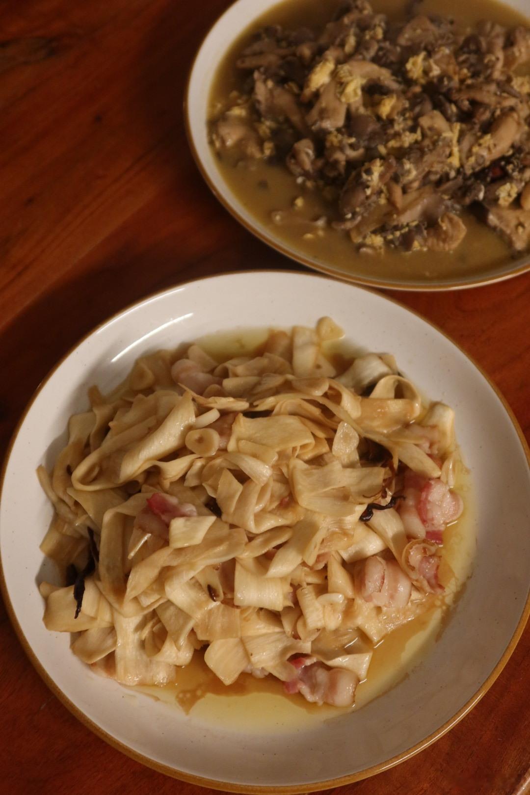 晚餐:茭白炒培根(亚超茭白好贵10刀一磅,得是空运吧)、鸡蛋炒蚝菇、紫薯小米粥
