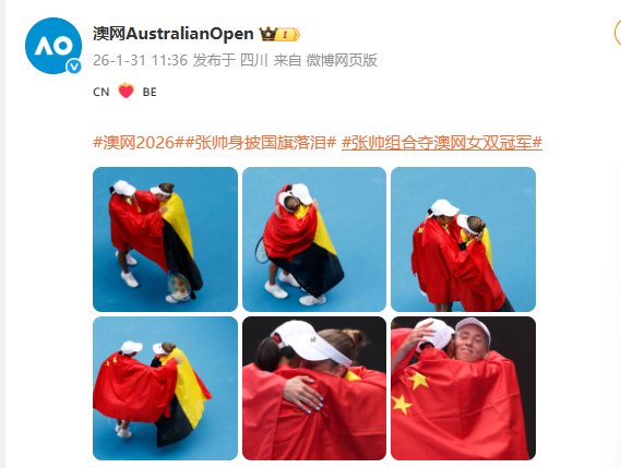 【#澳网恭喜张帅夺冠#】#澳网发张帅夺冠照# 1月31日,在2026澳大利亚网球公开赛女双决赛中,37岁的中国球员张帅搭档比利时球员梅尔滕斯在首盘1-4落后的逆境下顽强追击,最终以2-0战胜7号种子达尼丽娜/克鲁尼奇,夺得冠军!这是张帅在2019年搭档斯托瑟夺冠后再次收获澳网女双冠军。澳网官方发文祝贺张帅:🇨🇳 ❤️🔥 🇧🇪 #澳网发文祝贺张帅夺冠# #澳网祝贺张帅夺冠#
