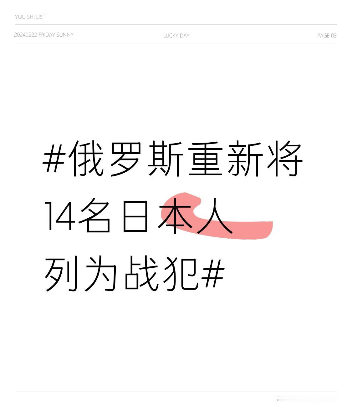 俄罗斯重新将14名日本人列为战犯 俄罗斯重新将14名日本人列为战犯,这事儿可太有必要了。当年日本在二战期间犯下了累累暴行,给包括俄罗斯在内的众多国家带来了沉重灾难。 这14名战犯参与了残忍的战争罪行,他们对无辜百姓的迫害、对战俘的虐待,桩桩件件都是不可饶恕的。俄罗斯此举是对历史真相的坚守,也是对受害者的告慰。 日本部分人至今还试图否认、歪曲历史,这种态度实在可恶。俄罗斯重新认定战犯,就是要让日本正视历史,别再在错误的道路上越走越远,必须为曾经的罪行负责。