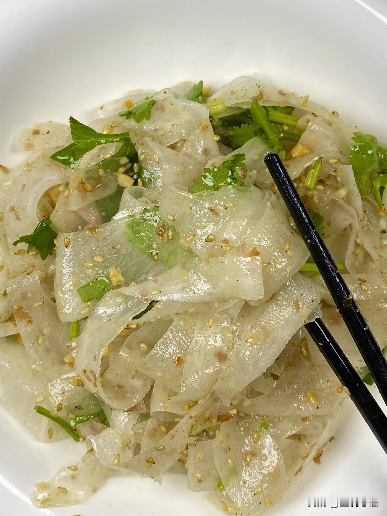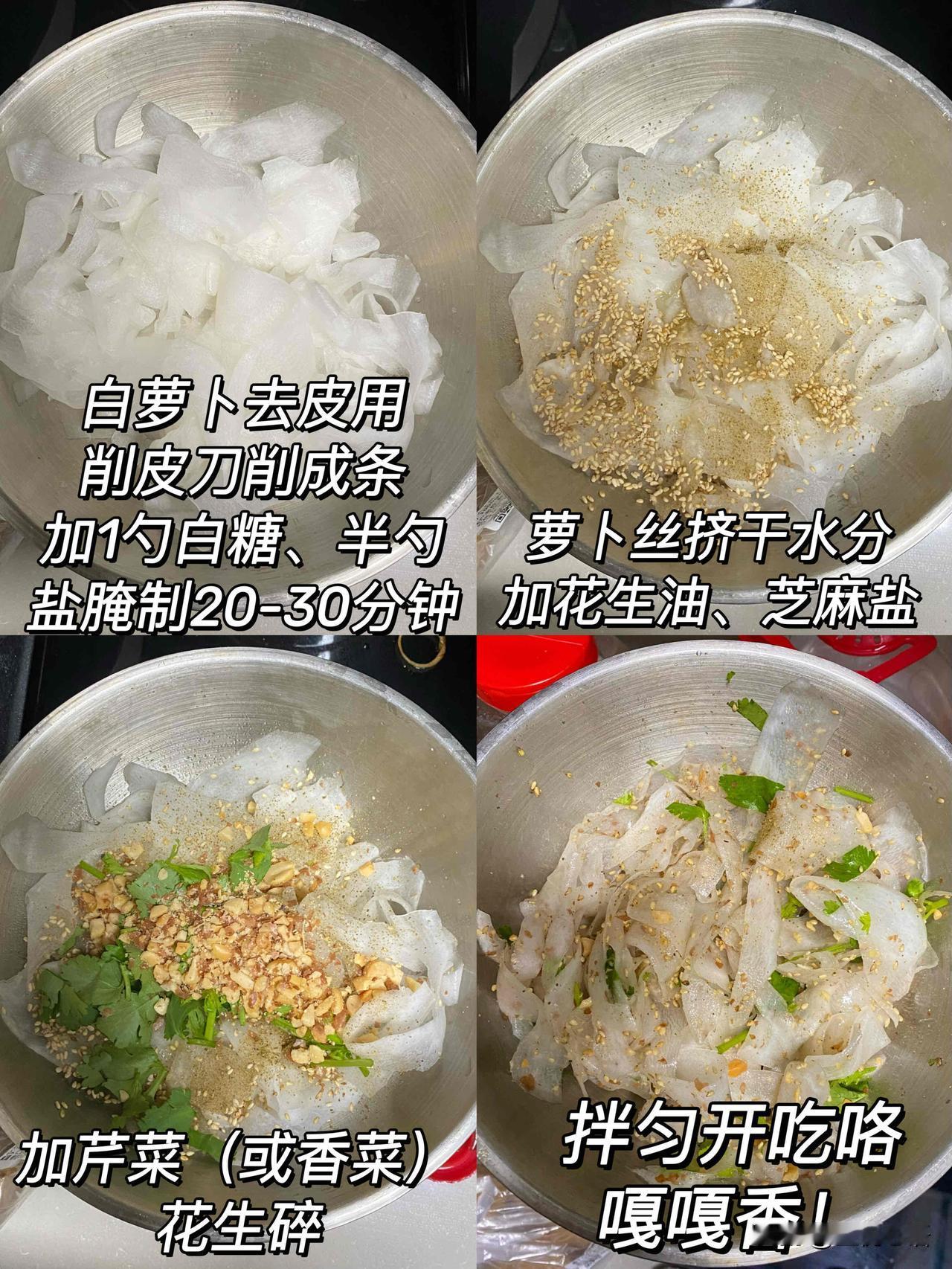 有幸在朋友家吃过一回,爽到飞起! 被朋友家这道凉拌萝卜丝狠狠拿捏了! 做法巨简单: 小白也能上手! 白萝卜削条, 加白糖和盐腌20多分钟挤干水。 再拌上花生油、芝麻盐, 撒点芹菜碎和花生碎,齐活! 口感脆生生的,咸香中带点鲜,一点不寡淡。 配米饭、配粥都绝了,妥妥的下饭神器! 这么快手又好吃的凉拌菜, 赶紧安排起来,真的不会失望~