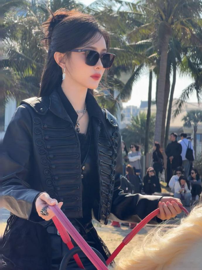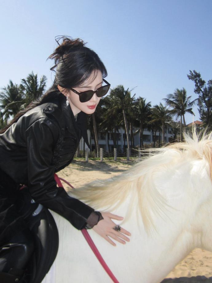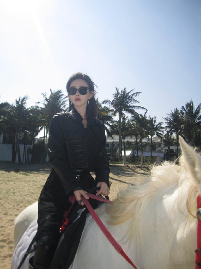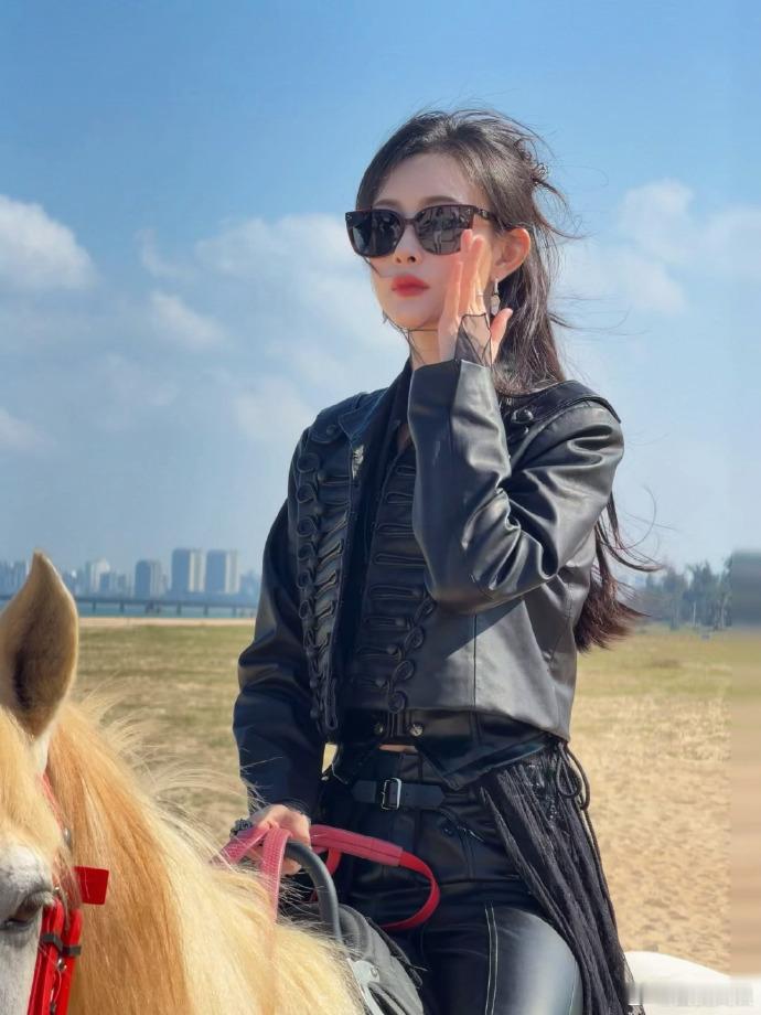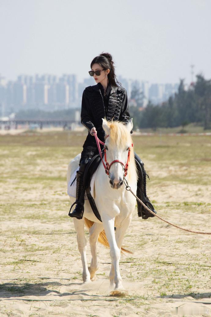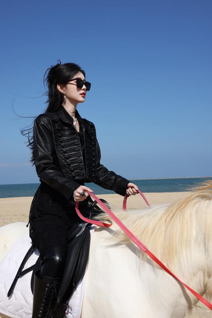 身着黑皮衣的孟子义完成骑白马的动作,人物与载体的搭配让画面更具视觉冲击,冲击让画面更易被记住。孟子义黑皮衣骑白马孟子义骑白马