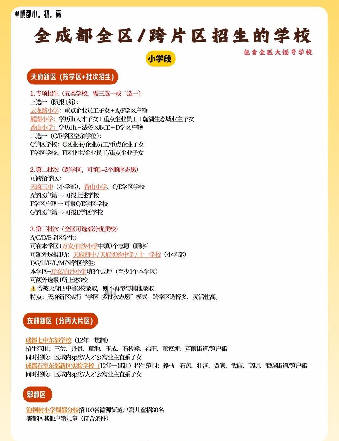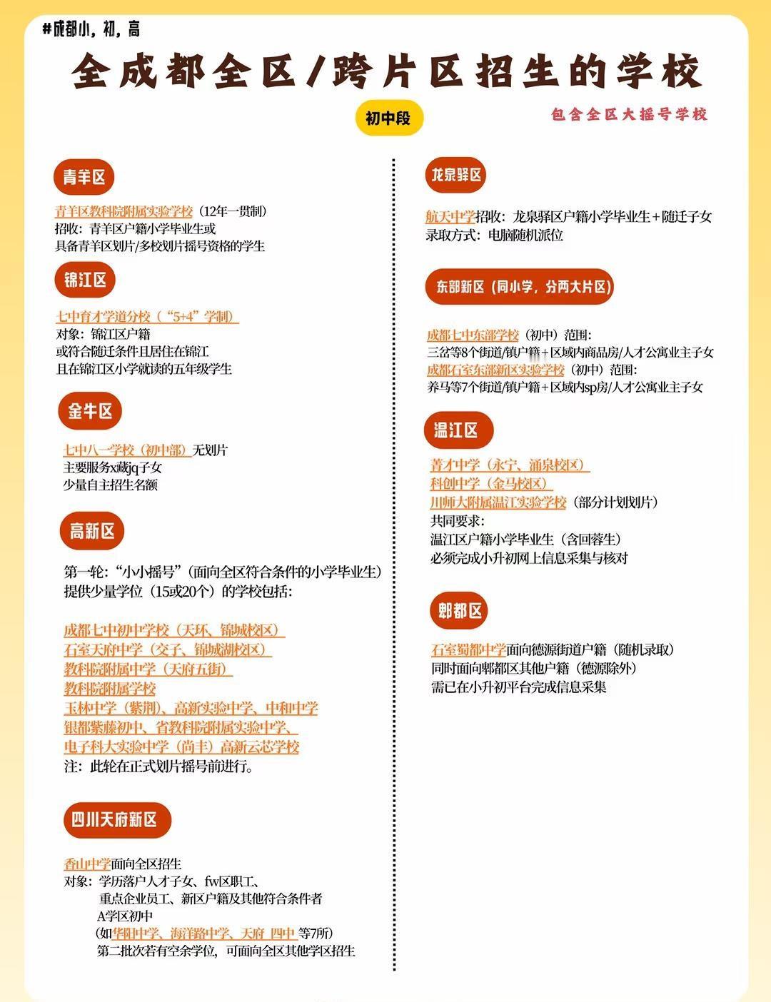 全成都全区/跨片区招生的学校 幼升小、小升初以划片摇号为主,你在哪个片区就上该片区的学校; 初升高按照考区政策升学,你在哪个考区就报考该考区的高中。 但是以上学校是可以跨片区,或者全区大摇号的学校 成都择校 成都小升初 成都升学 小维聊升学 成都公立初中 成都中考 成都私立初中 成都升学规划 成都幼升小 成都初升高