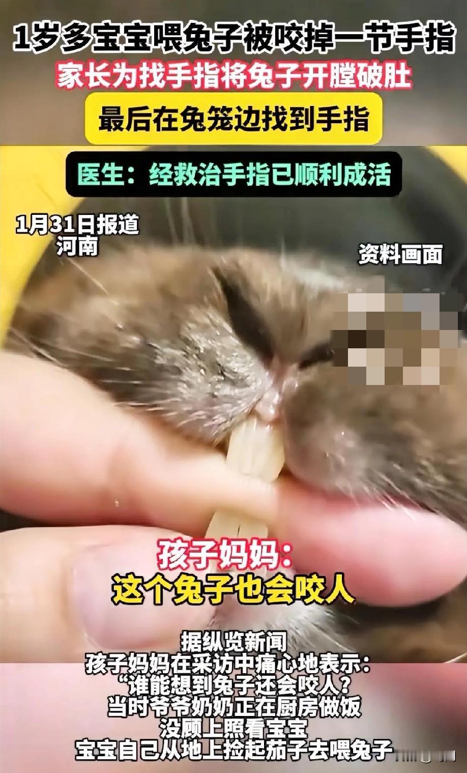 河南1岁多宝宝喂兔子被咬掉一节手指! 妈妈:没想到兔子也会咬人! 医生:家长说手指在兔子肚子里,就把兔子开膛破肚了,但是没有找到…… 当时爷爷奶奶正在做饭,没有管宝宝,孩子就捡起地上的茄子去喂兔子,就那么一瞬间没看住,宝宝的食指带着指甲盖一节都咬掉了,后赶紧前往医院,由于兔子肚子里并没有手指,家长最后在兔笼子的角落找到,郑州仁济医院创伤显微外科副主任医生称目前手指顺利成活! 老话说的好!兔子急了会咬人!狗急跳墙!不是人人都知道吗[捂脸][捂脸][捂脸]有牙齿的动物都要小心哦,给孩子养起来当宠物更是不可取,万一咬到了造成的无法挽回的后果,后悔都来不及啦!