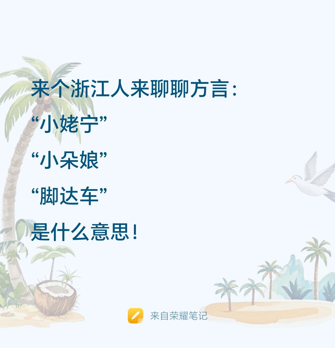 来个浙江人来聊聊方言: “小姥宁” “小朵娘” “脚达车” 是什么意思! 当然这几个方言,估计也只有部分城市的浙江人知道。毕竟浙江不同城市,甚至不同县区的方言都可能不一样的。 那么大家猜猜看,这三个名词,在浙江方言中是什么意思。 方言