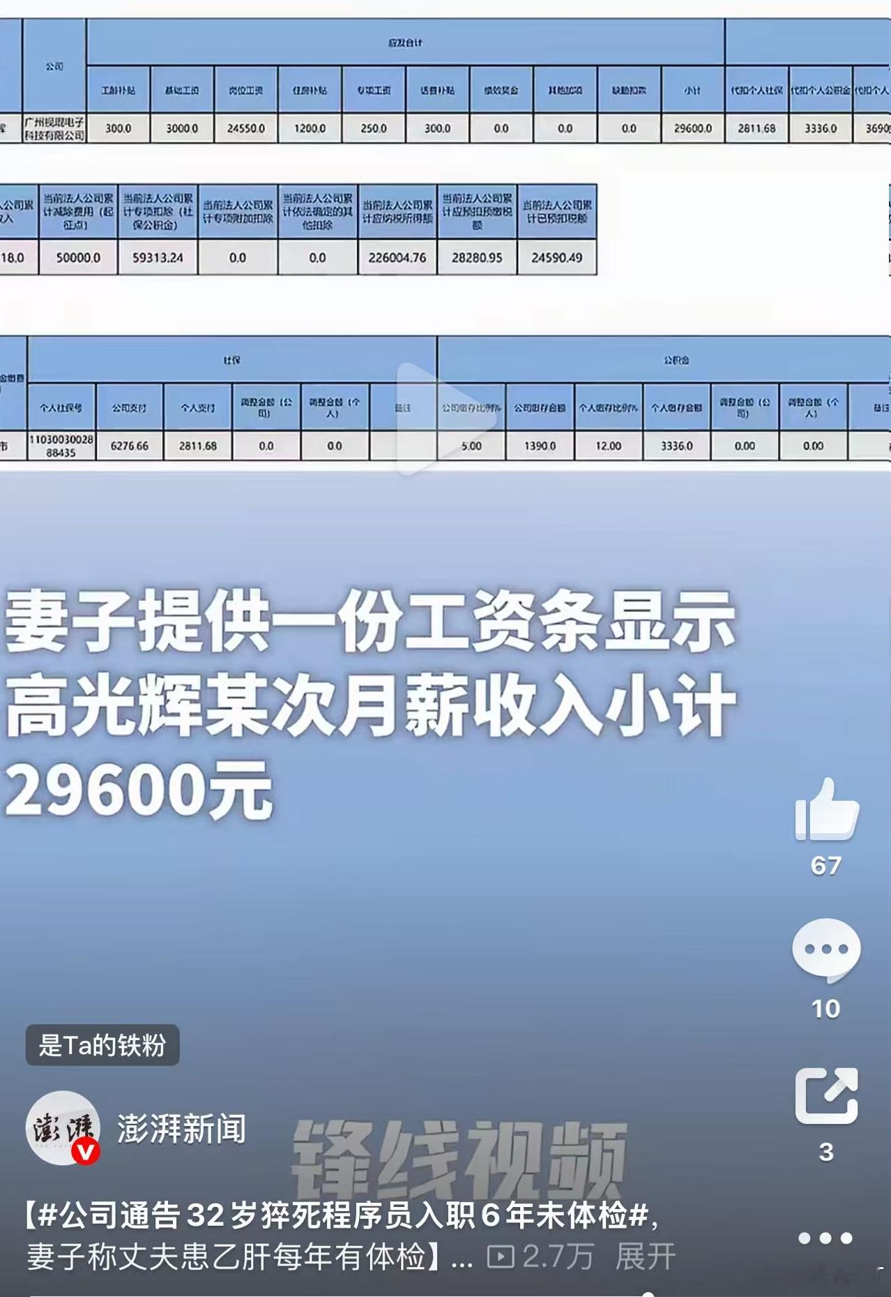 根据澎湃新闻报道,死者妻子提供的工资条显示,死者在某个月份的基础工资确为3k,但实际应发却是将2.96w,刨除2.8k的社保和3.3k的公积金,最终到手工资大概有2w多。