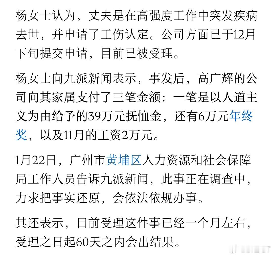 根据媒体报道,事发后,公司曾向死者家属支付了3笔钱:一笔是以人道主义为由给予的39万抚恤金,还有6万年终奖,以及11月的工资2万。