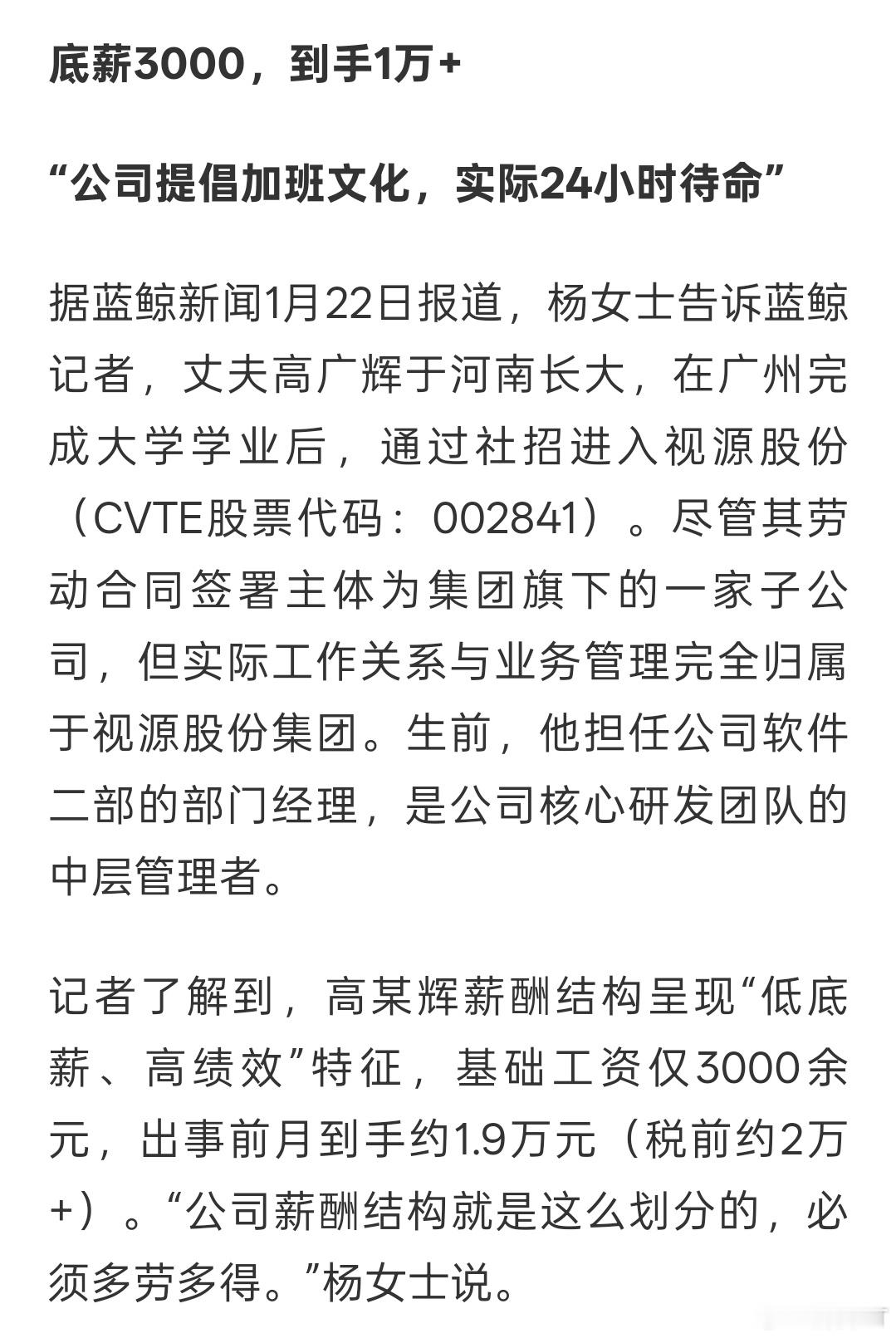 底薪3k,24小时待岗,到手约1w+(税前约2w+),这是死者妻子在接受采访时多次强调的。