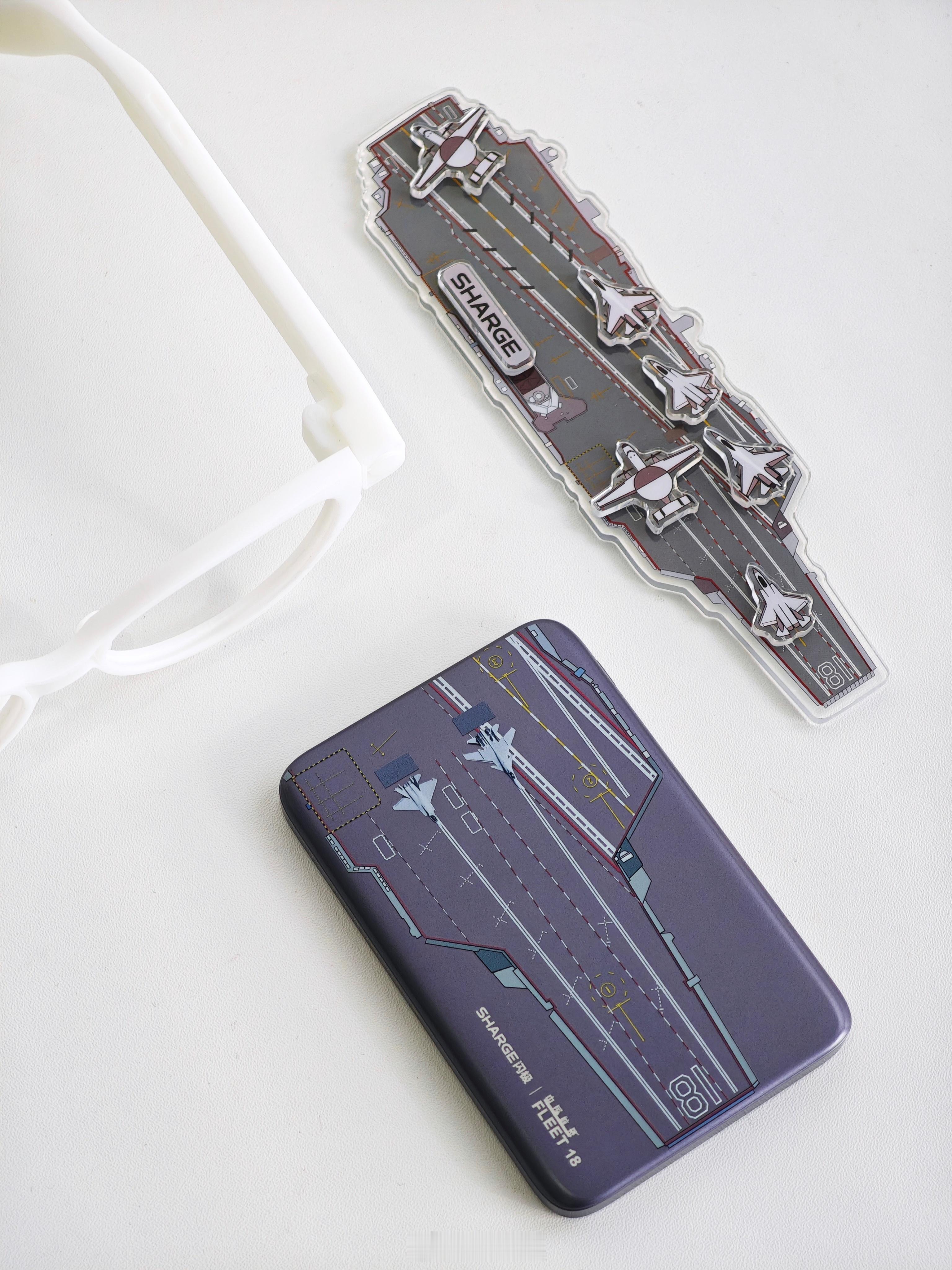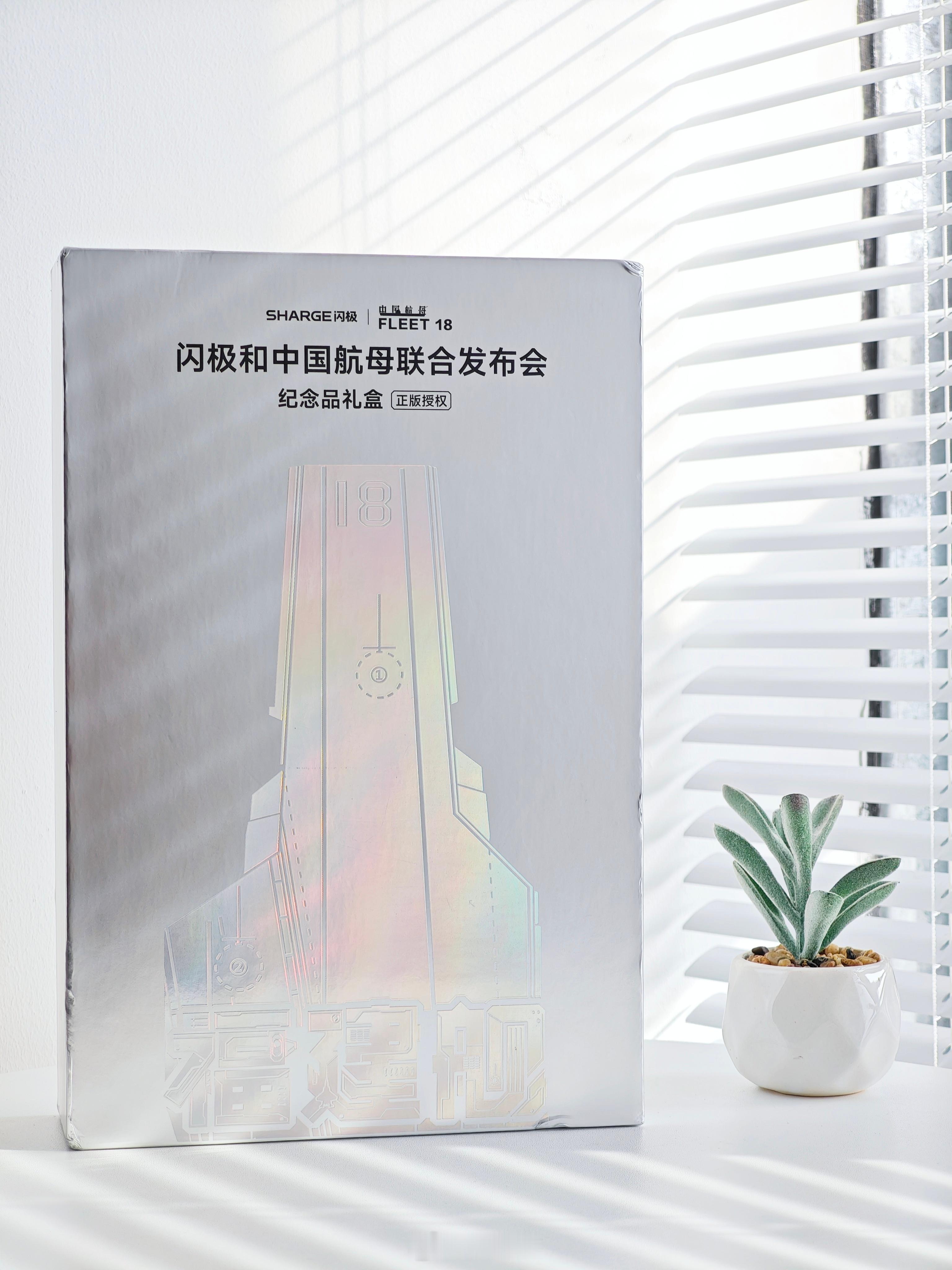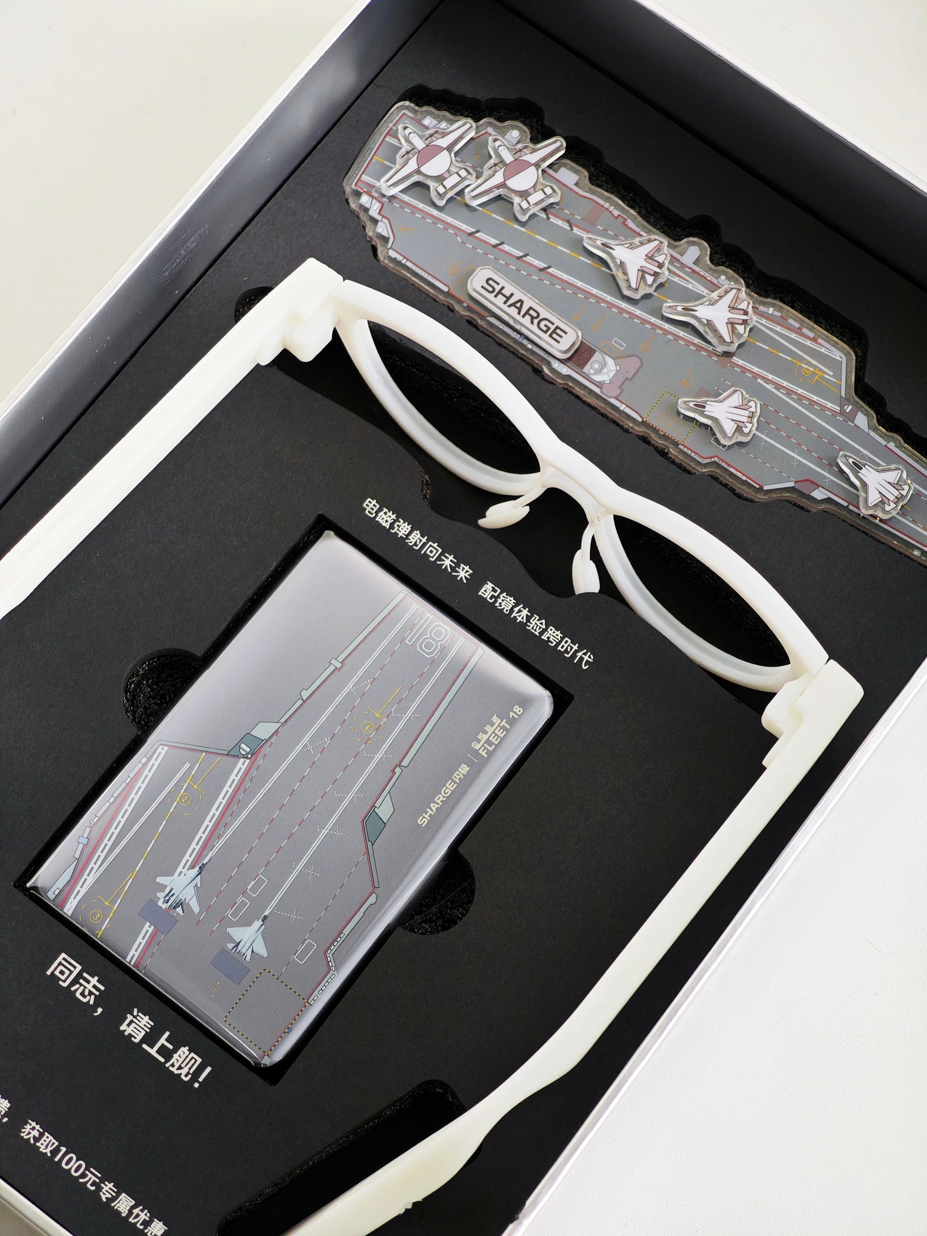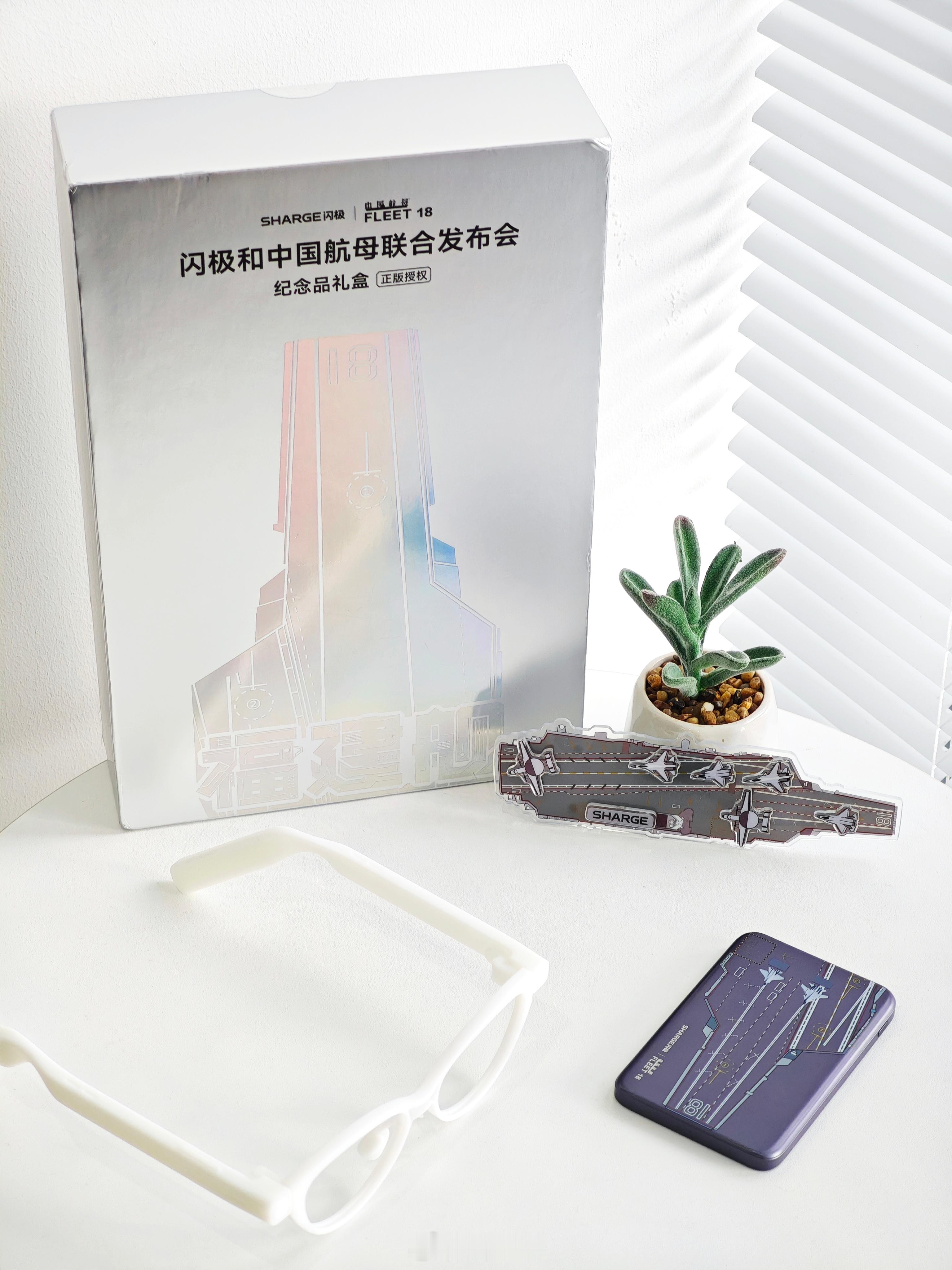 收到一套「闪极和中国航母联合发布会」纪念品礼盒。内含:中国航母冰箱贴、闪极「电磁弹射」磁吸移动电源(福建舰版)和 3D 打印眼镜模型。