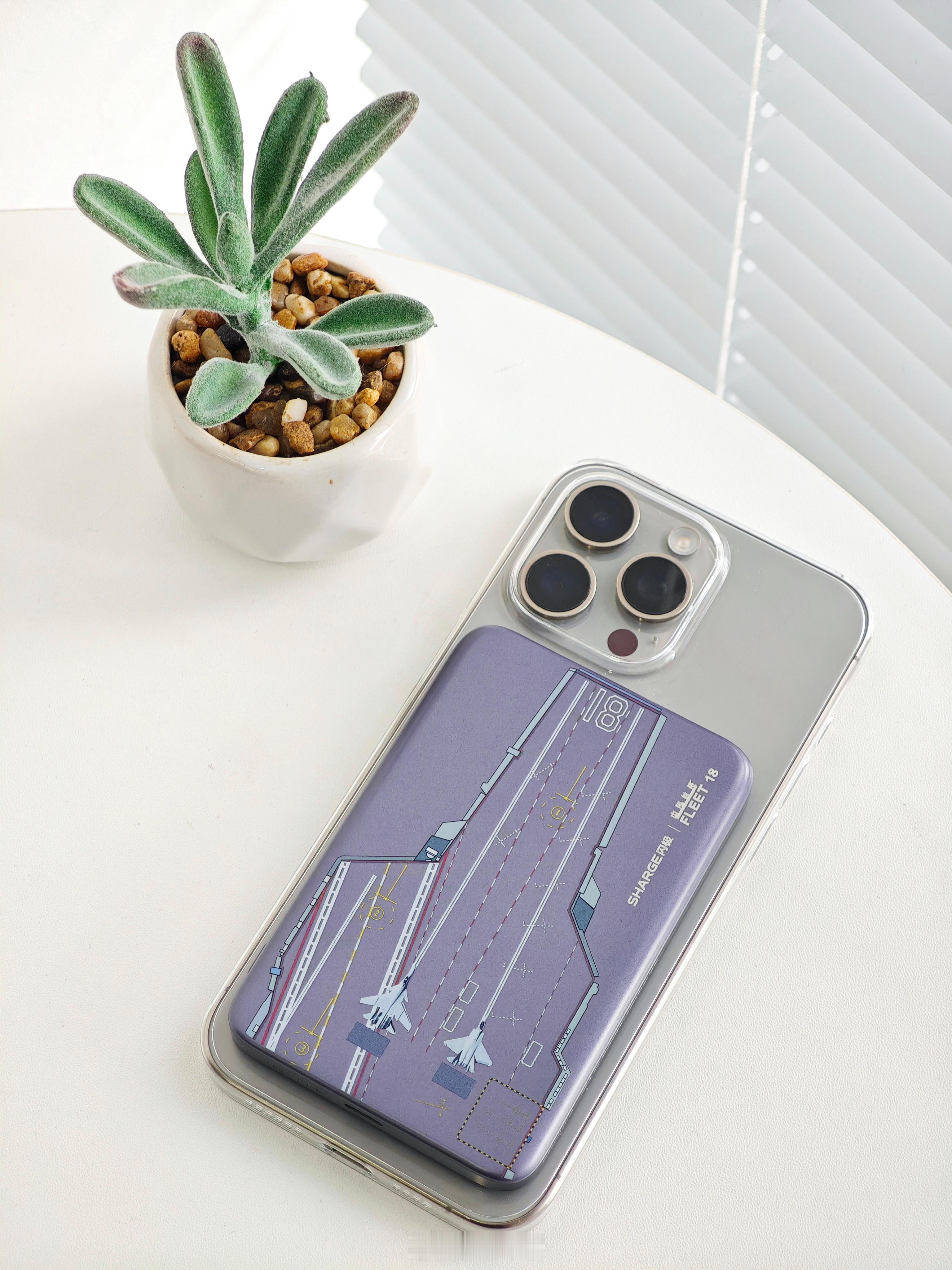 移动电源是闪极和中国航母联名限定版,5000mAh 电池容量,超薄的航母甲板设计,支持 Qi 2.0 快充协议,可为 iPhone 提供 15W 的无线快充。