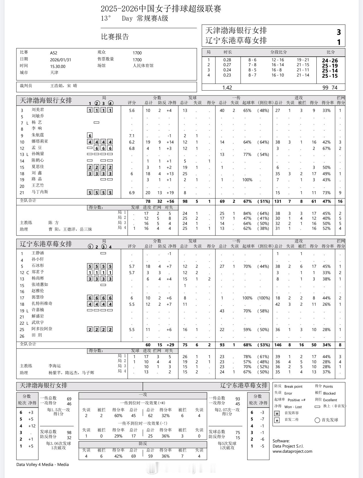 【技术统计】排超联赛第13轮,天津女排3比1辽宁女排(24-26 25-19 25-14 25-15)