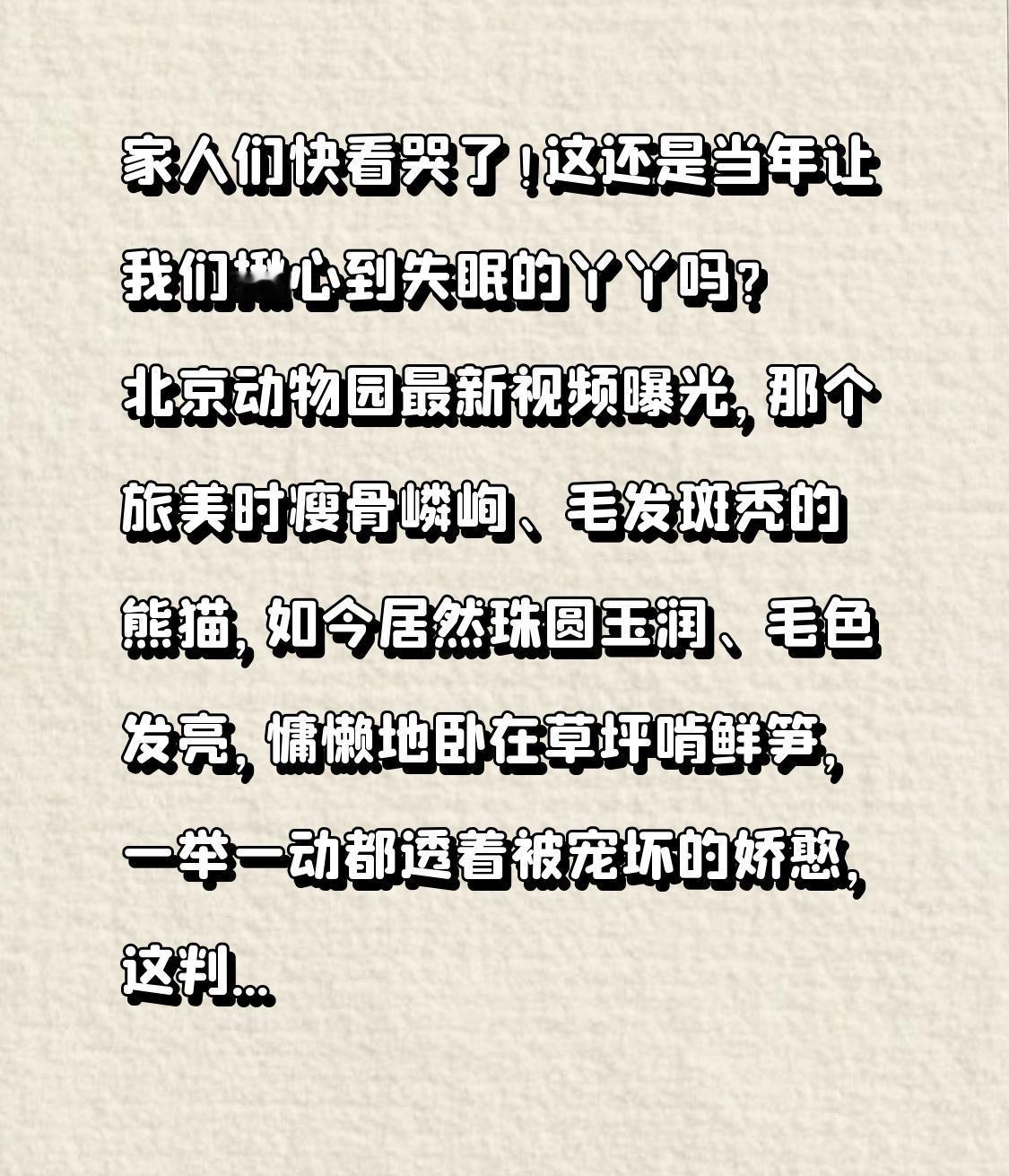 家人们快看哭了!这还是当年让我们揪心到失眠的丫丫吗?北京动物园最新视频曝光,那个旅美时瘦骨嶙峋、毛发斑秃的熊猫,如今居然珠圆玉润、毛色发亮,慵懒地卧在草坪啃鲜笋,一举一动都透着被宠坏的娇憨,这判若两熊的蜕变,真的太治愈了! 谁能忘记2023年的春天?26岁的丫丫结束20年旅美生涯回国时,体重只有75公斤,脊骨清晰可见,毛发干涩得像枯草,还总不停踱步转圈,那是长期营养不良和焦虑留下的刻板行为。尤其是同伴乐乐在归国前离世,更让无数网友为丫丫的命运捏紧了心,“接丫丫回家”的呼声曾刷爆全网,大家隔着屏幕为这只漂泊的国宝流泪请愿。 可谁也没想到,两年多时间,故土的温柔竟创造了奇迹!现在的丫丫体重稳步增至95公斤,刚好是老年雌性熊猫的理想体重,曾经脱落的毛发长出浓密新绒,皮肤病彻底痊愈,体况评分从触目惊心的2/5跃升至健康的4/5。更让人动容的是,她眼里的迷茫消失了,取而代之的是沉静与满足,每天慢悠悠巡视领地、午后在树荫打盹,偶尔还会跟隔壁的“越狱明星”萌兰隔栏互动,刻板行为从每天30多次降到3次以下。 这蜕变的背后,藏着最用心的守护。北京动物园为丫丫打造了250平方米的“熊猫别墅”,恒温18-22℃、恒湿65%-75%,防滑地面、定制栖架,连日照时长都科学测算。饮食更是顶配:每日22公斤新鲜箭竹轮换供应,搭配高纤维窝头、苹果胡萝卜,钙磷比严格控制在1.3:1,还有专人轮班监测健康、做关节养护。从肠道菌群调理到牙套适配,从气味丰容到心理安抚,每一处细节都在诉说“国宝就该被这样珍视”。 最戳人的转折点是,丫丫的改变早已超越了一只熊猫的命运。曾经在海外,她是“外交工具”“流量展品”,却难获系统性老年照护;归国后,她成了被科学呵护的生命,公众也从“打卡围观”变成了关心她的进食量、睡眠质量,这种从“观赏”到“共情”的转变,正是社会文明的进步。网友说得好:“爱人如养花,养熊猫也是如此”,丫丫的95公斤,不仅是体重的增长,更是尊严与安全感的回归。 如今28岁的丫丫(相当于人类85岁高龄),正安享着迟到的幸福。她的故事告诉我们,每一个生命都值得被认真对待,而这份跨越山海的守护,不仅治愈了丫丫,更温暖了无数国人的心。愿丫丫余生皆有竹香绕身、暖阳相伴,也愿所有漂泊的生命都能找到归宿,被世界温柔以待。 你还记得当年为丫丫流泪的日子吗?看到她现在的幸福模样,你最想对她说什么?欢迎在评论区留下祝福,点赞转发,让更多人看到这份治愈的蜕变,一起为生命的韧性点赞!