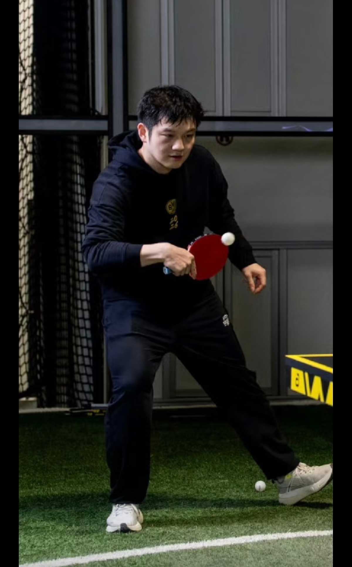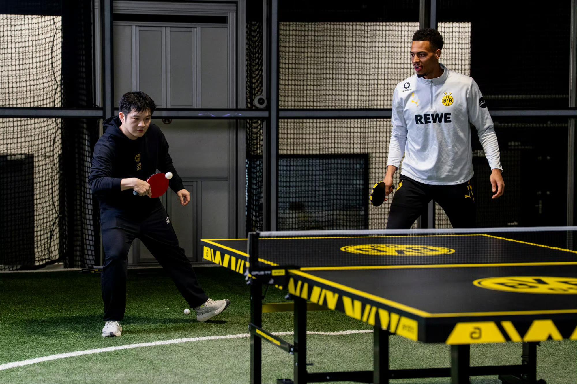 樊振东不仅出手不凡,出脚也是经典,一脚踢出德甲足球联赛logo