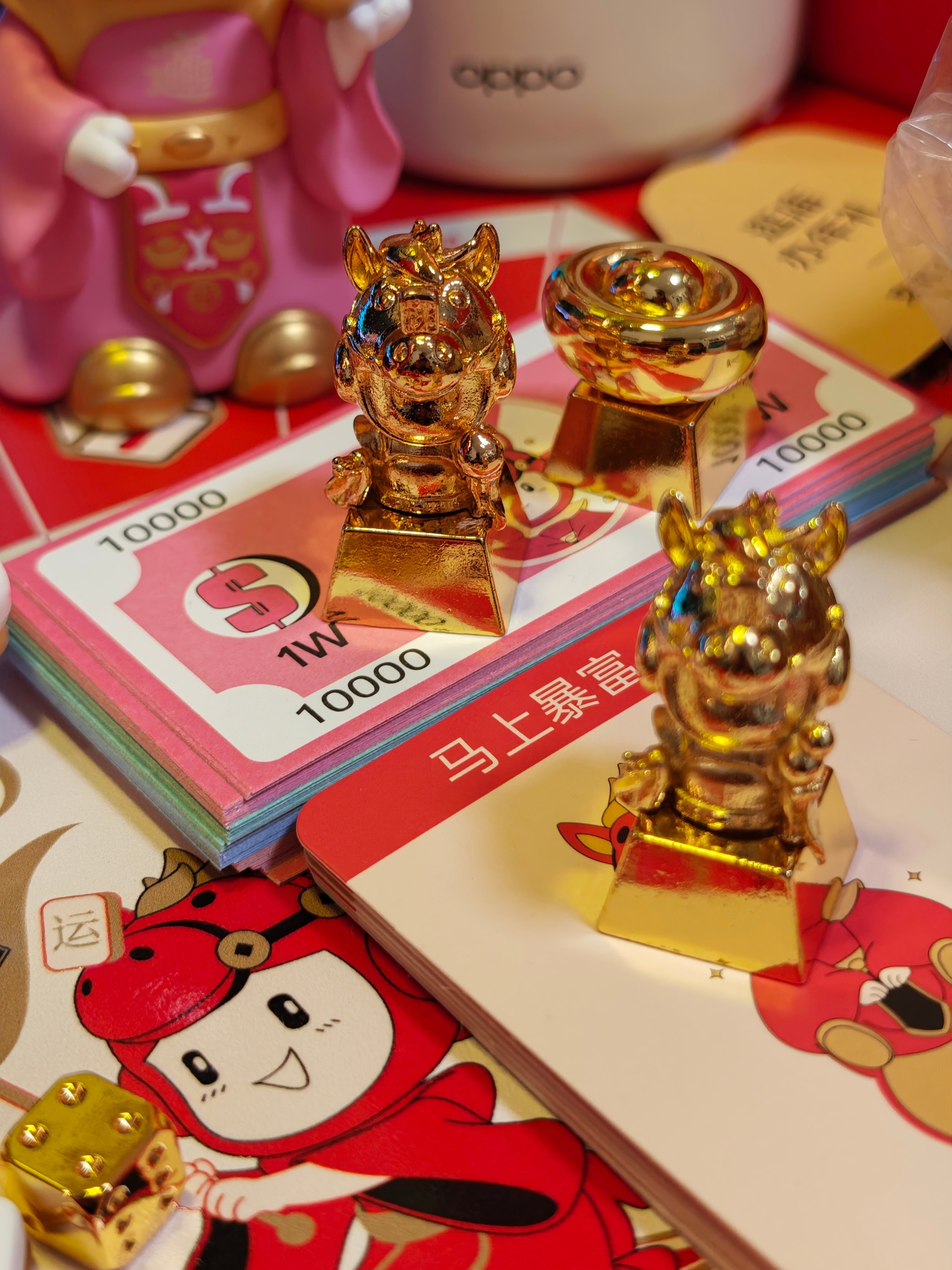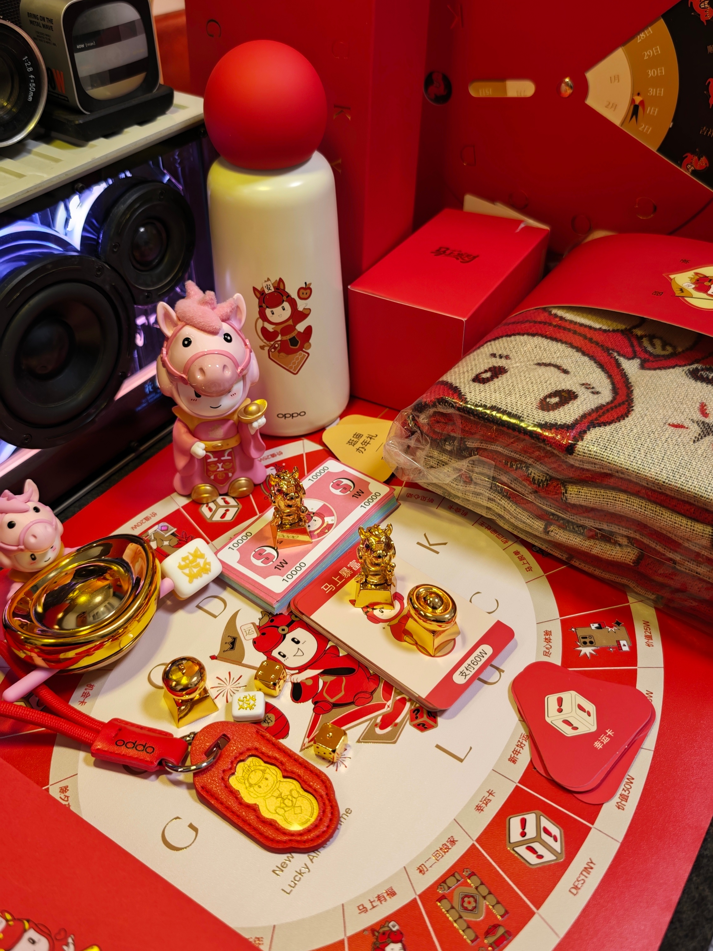 OPPO 2026新年礼盒,小欧化身财神爷送来金光闪闪真黄金,马上暴富大富翁,超级解压金木鱼,再加欧皇毛毯加身,相信2026定会时来运转!OPPO