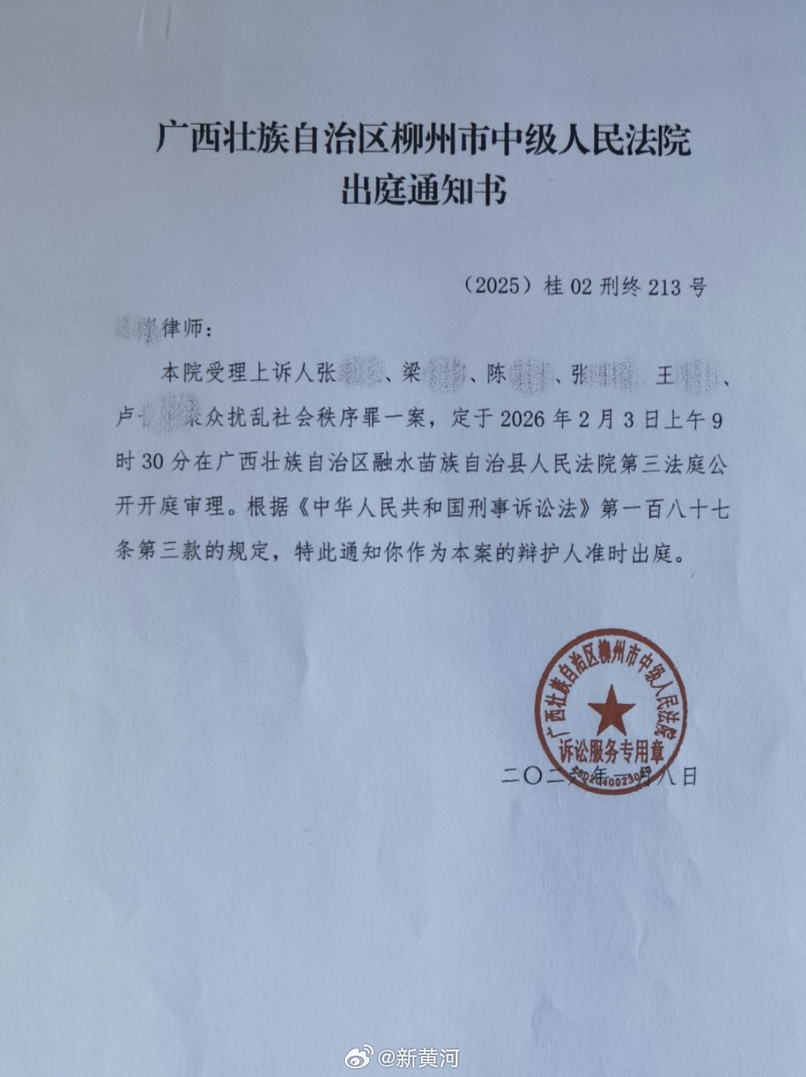 1月30日,新黄河记者从被告辩护律师处获悉,目前张某武、梁某铭等6人对于一审法院判决不服,认为自己不应以聚众扰乱社会秩序罪论处,均已进行上诉,案件将于2月3日在柳州市中级人民法院开庭审理。(新黄河记者:李庆斌)