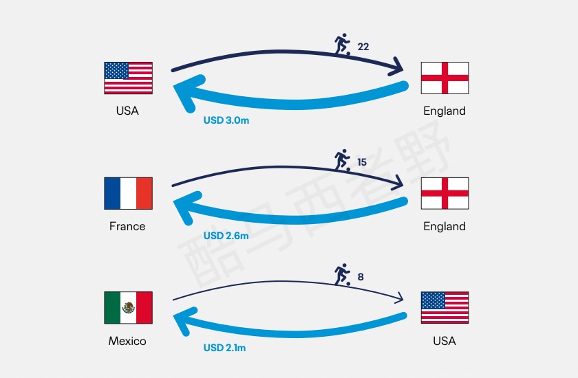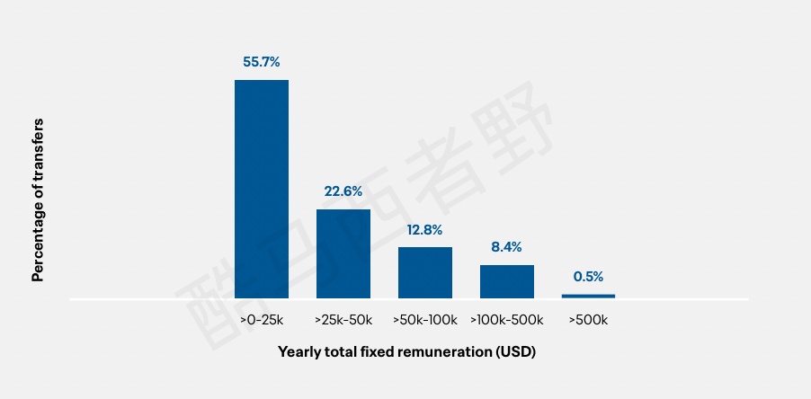对女足球员留洋和女超女甲联赛引进外援感兴趣的球迷可以看看这个,根据2025年国际足联全球转会报告,图一是2025年各大洲之间及各大洲内部的转会数量,有几个特点,一,欧足联内部的转会数量是最大的,也就是说欧洲联赛市场化是最好的,二,中北美和加勒比足联(美国、加拿大、墨西哥都是其中的成员)和欧足联之间的人员流动是第二大的,三,除了前面提到的两个洲,其他的南美足联、非洲足联和亚足联都属于一个层级,无论外界还是内界的人员流动都差不多,大洋洲的存在基本可以忽略。亚洲是除了欧洲之外,非洲球员留洋的第二选,不知道咱们女超和女甲联赛在2025年这53人中贡献了多少人? 图二2025年国际转会年度固定总薪酬分布情况,从这个表我们就能看出现在全球女足球员收入层级的占比,关注我的女足球员们你们可以看看2025年自己的收入大概属于高产、中产还是低产阶层,举个例子,我折算了一下女足球员的中间收入,全球占12.8%的球员收入是在35万到70万人民币。 图三2025年女足转会市场转会费支出(单位美元)排名前三的转会渠道,这也就是我极力推荐想要留洋的中国球员最佳目的地法甲的原因之一