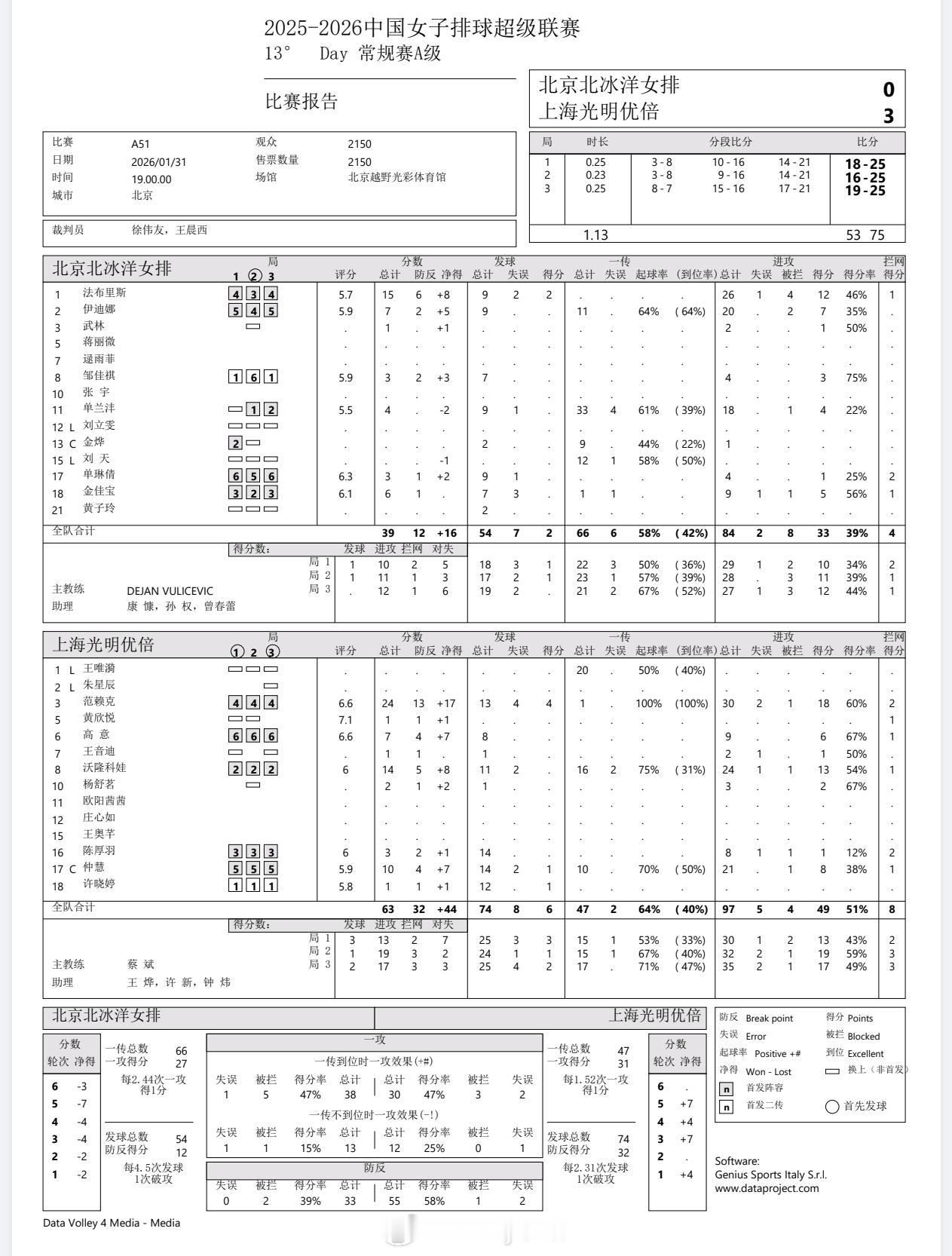 【技术统计】排超联赛第13轮,北京女排0比3上海女排(18-25 16-25 19-25)