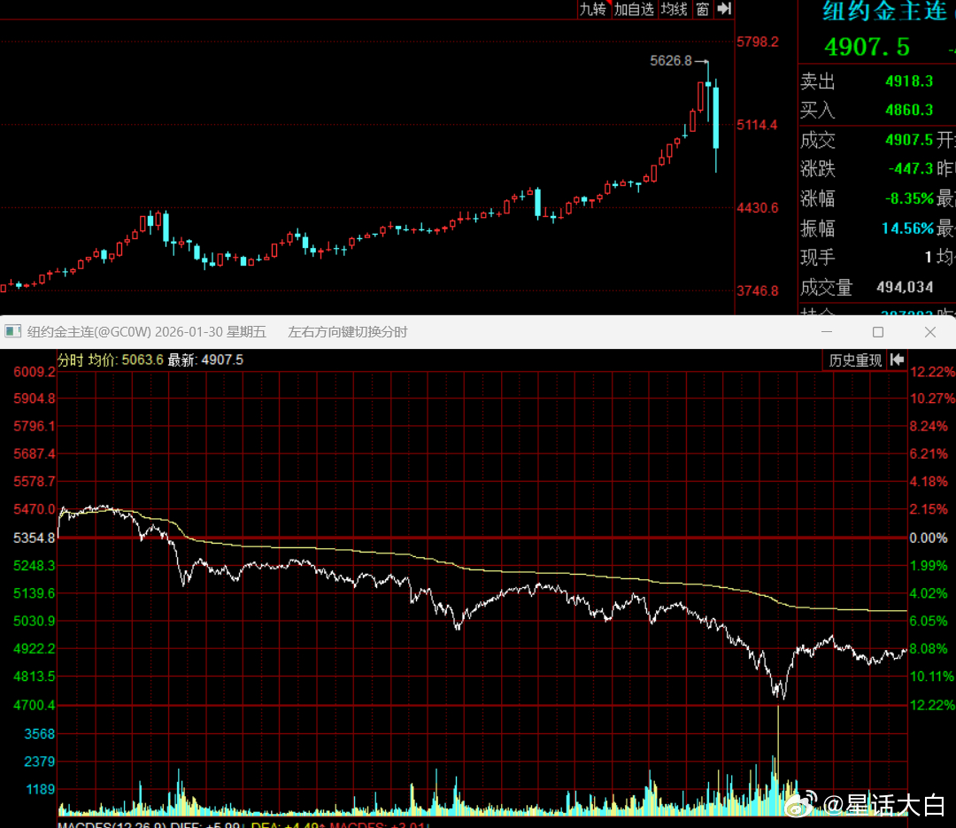 连续多日疯涨的国际黄金和白银,在1月30日出现史诗级暴跌。国际黄金价格在1月29日才刚冲过5600美元。但到了30日晚上,最低就跌到了4700美元,单日最大跌幅达到12%,最终收盘价格是4907美元,收跌8.35%;国际白银价格,在1月29日最高涨到了121美元,在30日暴跌中,最低跌到74美元,最大跌幅达到35%,最终收盘价格85.2美元,收跌25%;这样的巨大波动,在黄金和白银价格历史上,也是很罕见的。这次黄金白银价格暴跌,最主要原因,就是过去三个月,黄金价格短线涨幅太大。金融市场是盈亏同源的,短线涨越多,一旦出现转折,也会跌越狠。纽约黄金价格在2025年4月7日,还是每盎司3000美元。但随后就开始一路暴涨,去年10月20日先涨到4300美元,然后出现一波10%的回调幅度。但很快,从11月开始,黄金再度一路暴涨,从3900美元,一路涨到1月29日最高的5626美元,最近三个月的涨幅就达到44%;相比黄金价格,白银涨更疯。我以前也有分析过,白银就是黄金的弹性放大器,白银大周期走势的趋势跟黄金基本是一致的,但白银的走势波动一直都会比黄金大很多。纽约银价格在2025年4月7日最低是27.5美元,然后就开始一路暴涨,一直到10月16日是涨到53美元,6个月涨幅是接近翻倍了。然后纽约银在一波短暂回调到45.5美元后,就开始这轮的逼空式疯涨,一路暴涨到1月29日最高的121.7美元,三个月涨幅达到167%;所以,不管是黄金还是白银,过去三个月的涨幅是巨大的,短线本来就积累了很大的回调风险。这也是我为什么会在1月29日中午会单独发一条动态短评,来提醒黄金的短线风险。结果黄金在29日晚上就有过一波暴跌。当时黄金在冲上5600美元之后,在29日晚上就在半小时内跌了7%,出现本轮黄金大涨以来的最大盘中调整幅度。不过,29日的黄金暴跌,抄底盘很多,以至于黄金在短线跌了7%后,愣是被拉回4%左右的跌幅。但这其实已经是很明确的风险警示信号。结果过了一天,在30日黄金和白银价格就出现暴跌走势。当然,对于黄金,我提醒的也只是短线风险,不改长期看好的趋势。所以,我一般只有在我认为比较关键的时间节点,觉得风险特别大的时候,才会顶着压力单独发动态提醒风险,平时基本不聊黄金走势。比如,去年10月21日,国际金价涨破4300美元时,我也单独提醒风险,随后有一波10%的回调幅度,但很快就开始新一轮上涨到今天最高5600美元。但看好黄金长期走势,跟短线有巨大风险并不冲突。比方说,如果爆发世界金融危机,按照2008年的走势,黄金可能短线跌30%,然后再出现翻倍涨势。那么这两天才追高买入的人,是否有做好被套30%的觉悟,到时候会不会割肉在谷底,这都是很大的问题。#金价波动##黄金白银牛市终结了吗#